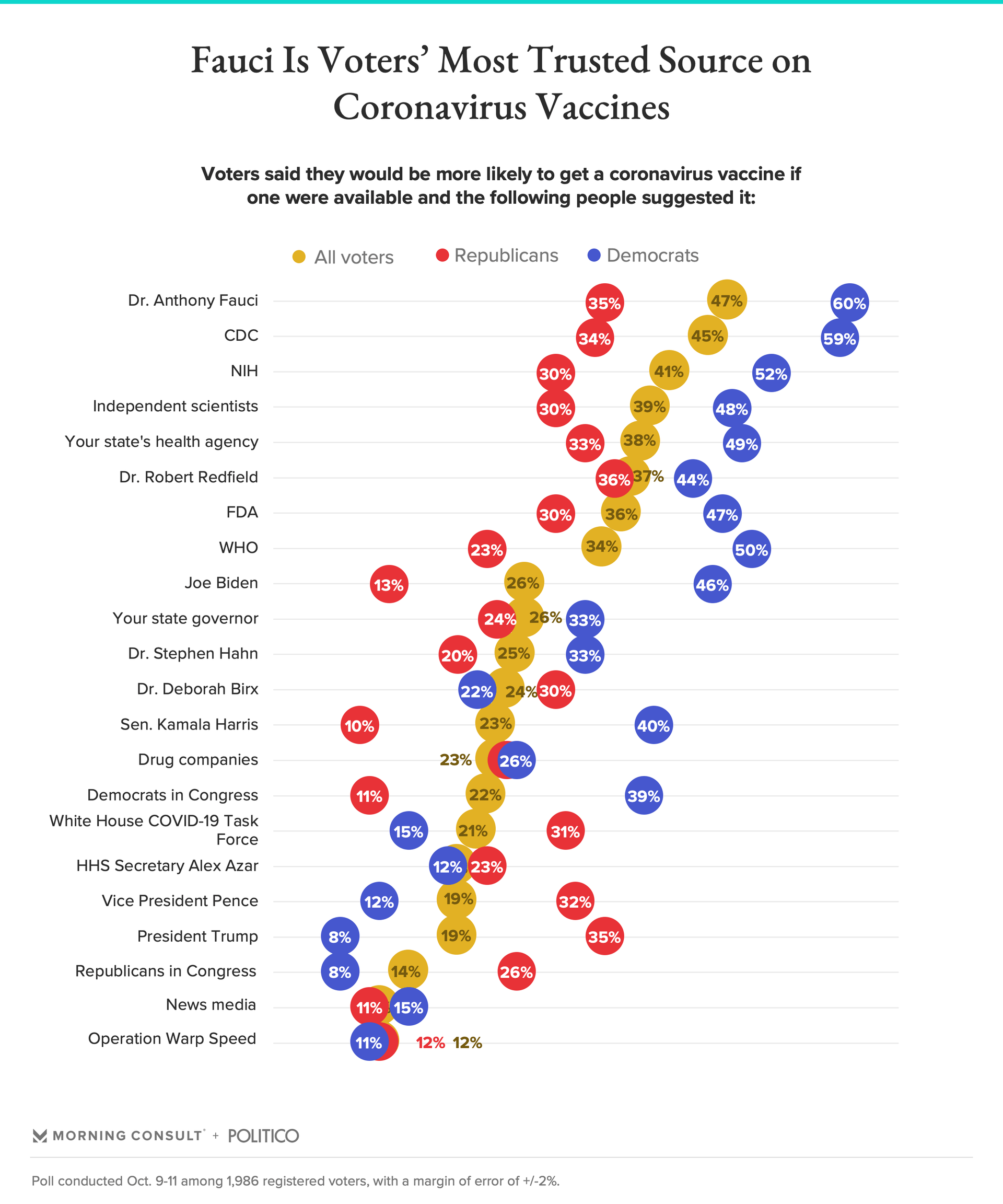 When it comes to voters’ willingness to seek a coronavirus vaccine, recommendations from federal health agencies hold significantly more weight than guidance from politicians, and nobody's word is valued above that of the nation’s top infectious disease expert, Dr. Anthony Fauci.