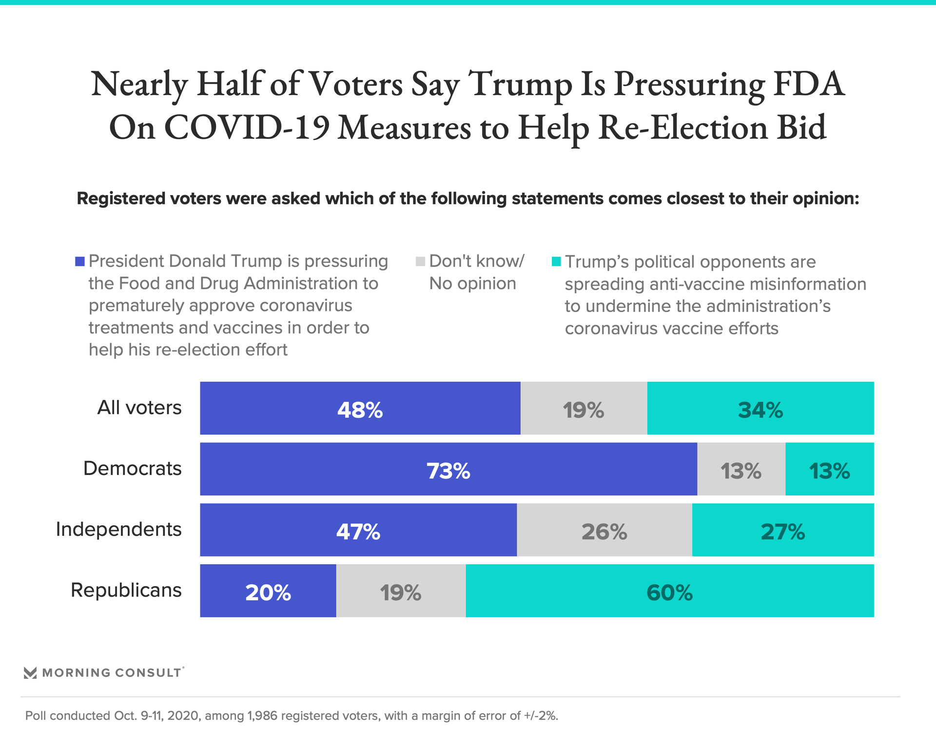 Meanwhile, 48 percent of voters said they think Trump is pressuring the FDA to prematurely approve coronavirus treatments and vaccines to help his re-election effort, while 34 percent said that the president’s political opponents are spreading anti-vaccine misinformation to undermine the Trump administration’s vaccine efforts.