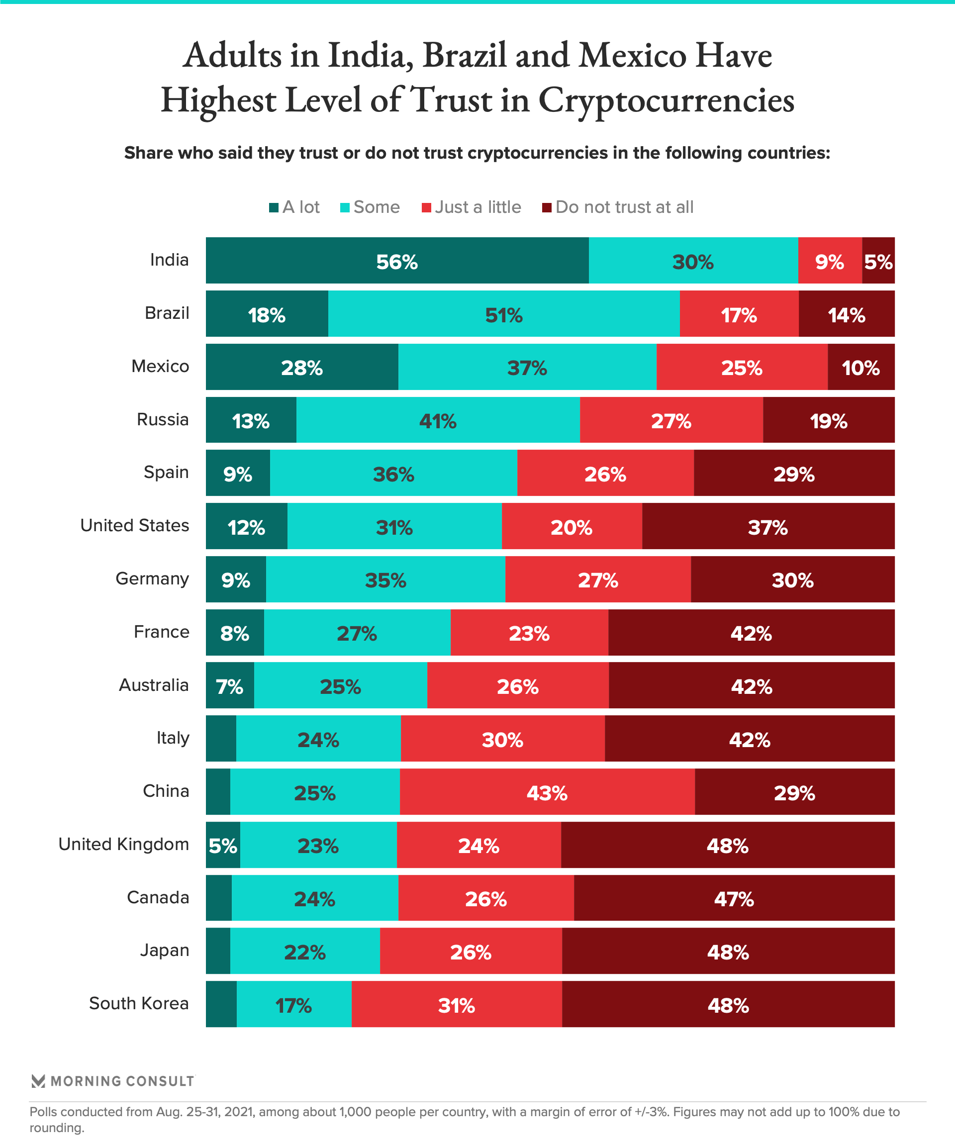 In surveys conducted among adults in 15 countries spanning North America, South America, Asia, Europe and Australia, India had the highest level of trust in cryptocurrency at 86 percent, followed by Brazil at 69 percent and Mexico at 65 percent.
