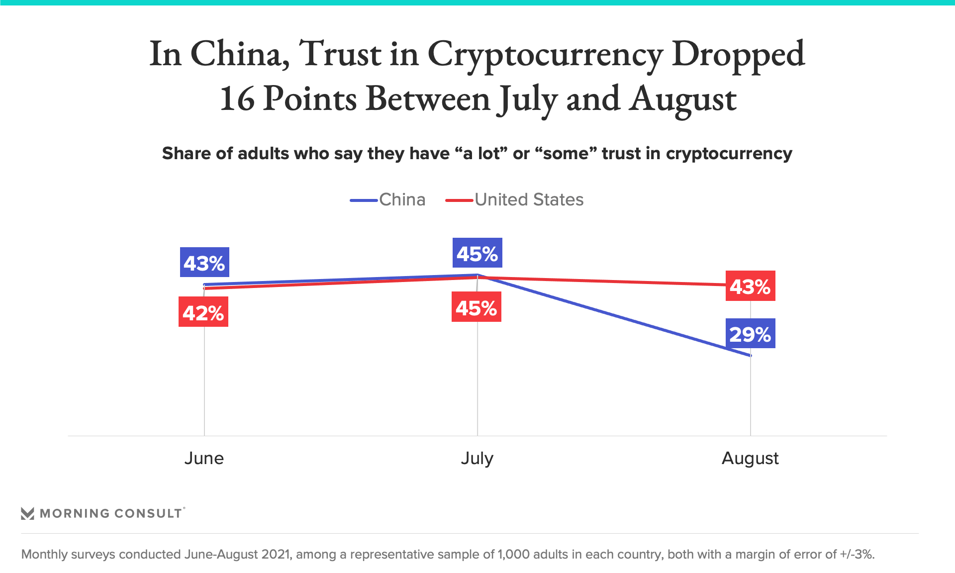Morning Consult data shows that trust in digital currency in China dropped well before the development in Hebei. In August, trust fell 16 percentage points to 29 percent, down from 45 percent in July.