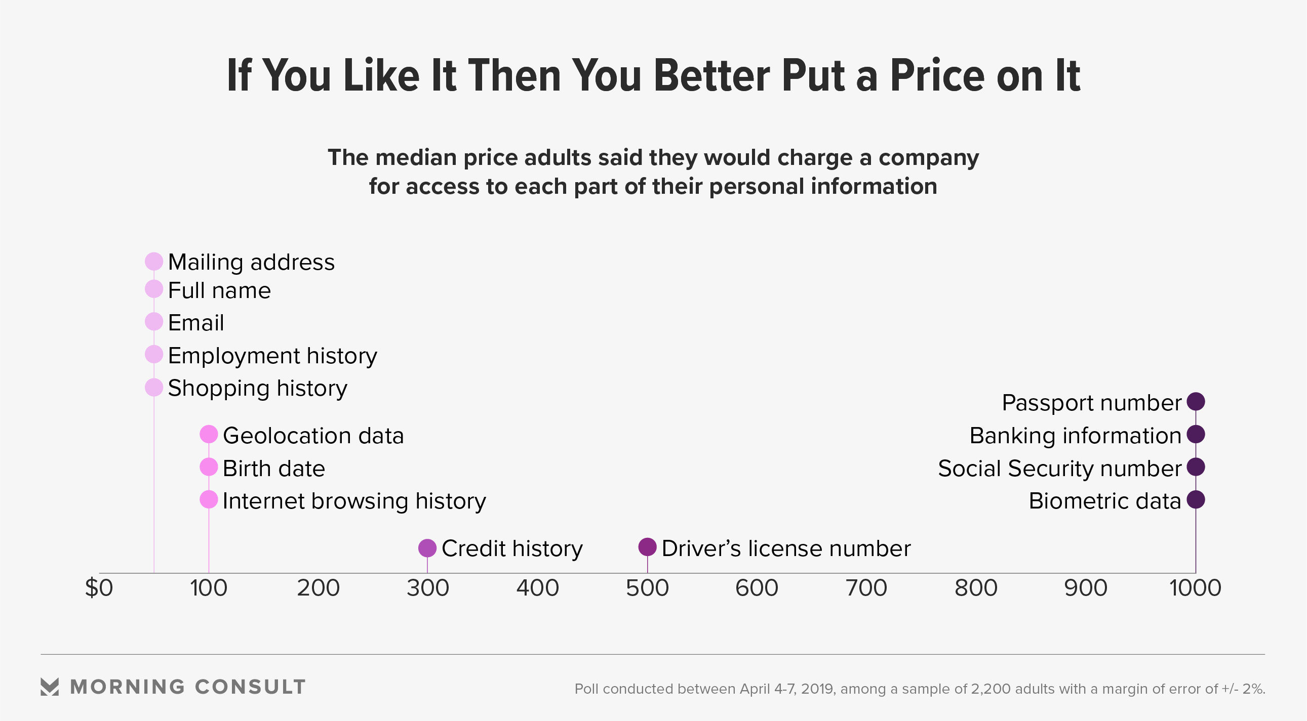 A Morning Consult survey, conducted April 4-7 among 2,200 U.S. adults, asked respondents to put a dollar amount on how much they think different pieces of their personal information are worth, gauging the monetary value for public information such as someone’s full name and mailing address as well as privately sensitive information including passport numbers and DNA.