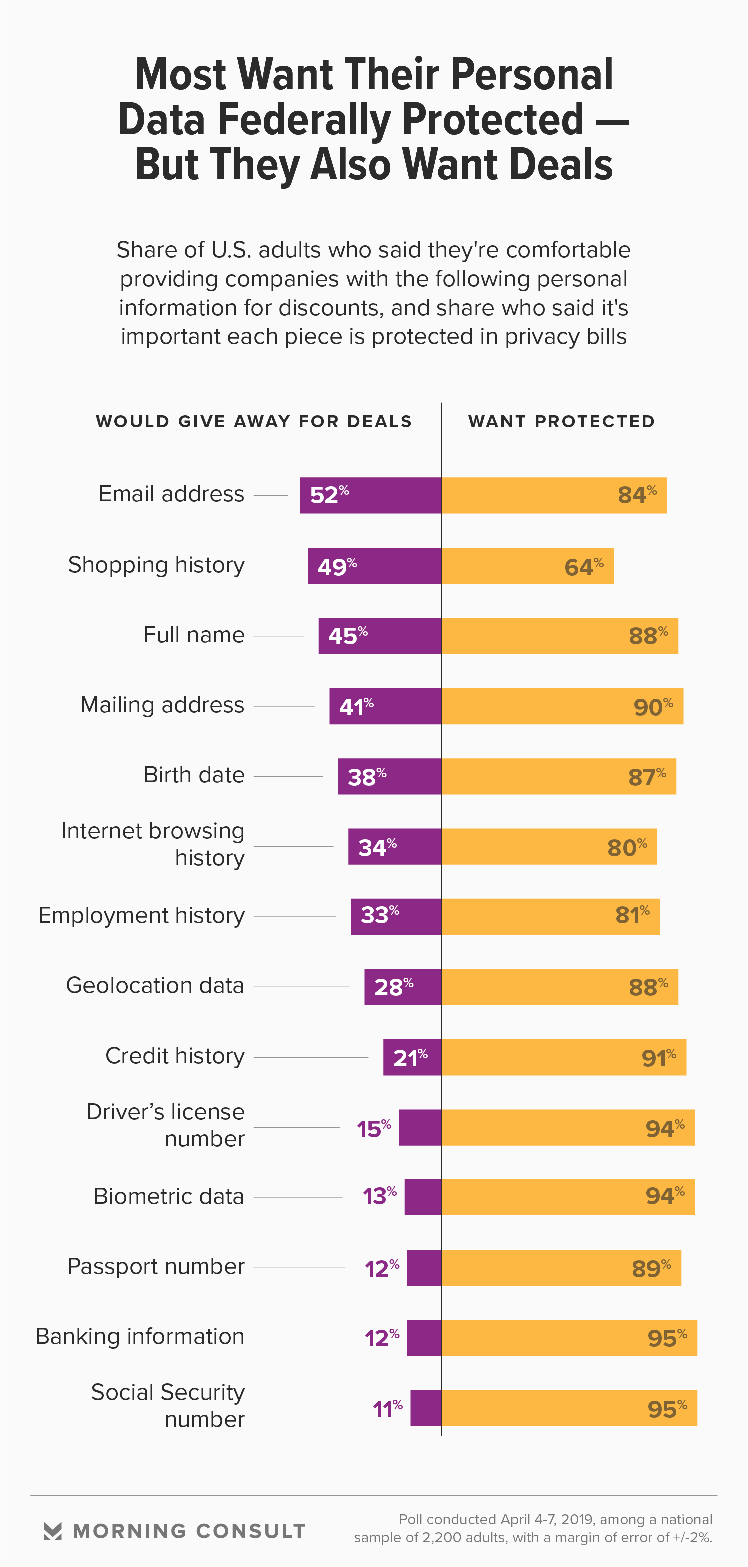 The reverse can be said for the kinds of data consumers said they feel comfortable giving to companies in exchange for discounts and deals: Email addresses (52 percent), shopping histories (49 percent) and full name (45 percent) topped the list.
