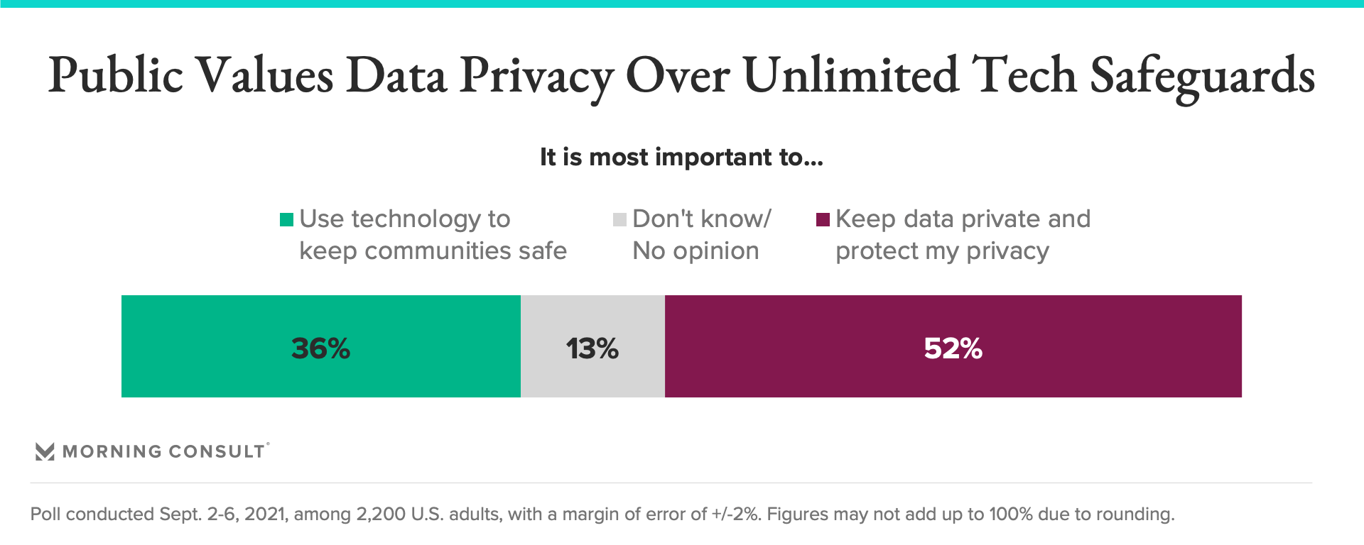 But when given the choice between using whatever technology is available to keep their communities safe or protecting their data privacy, 52 percent prioritized the latter, compared to 36 percent who said they preferred using any technology to enhance security.