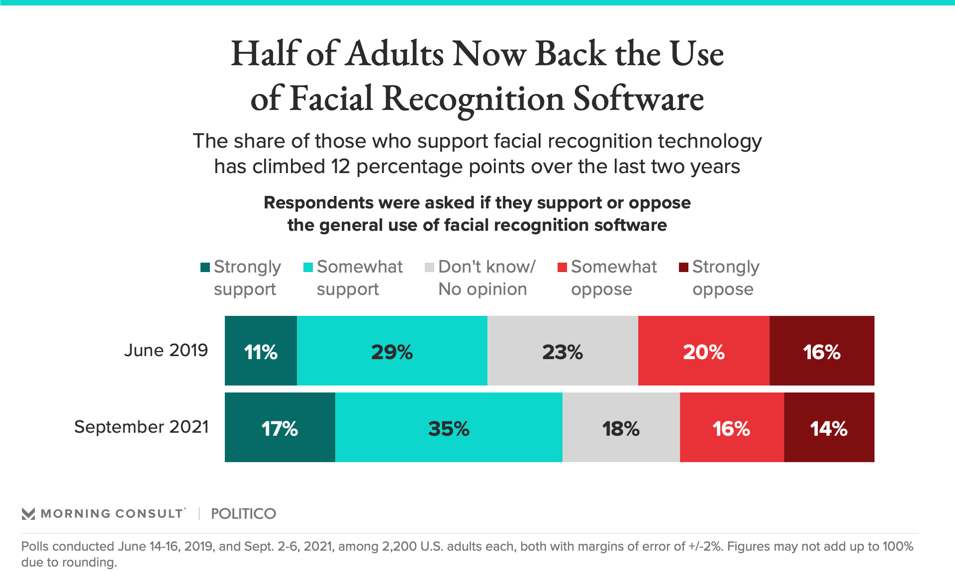 Support for facial recognition technology has climbed 12 points in two years, to 52%.