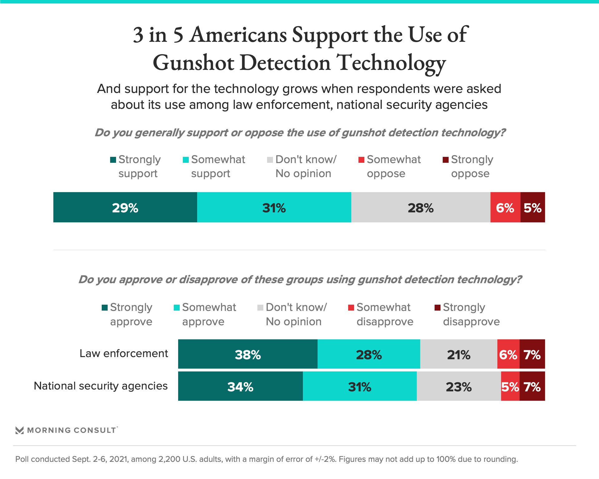 Sixty percent of U.S. adults back the use of gunshot detection technology in general, and that support increases to 66 percent for its use by law enforcement and 65 percent for national security agencies, according to a new Morning Consult poll.