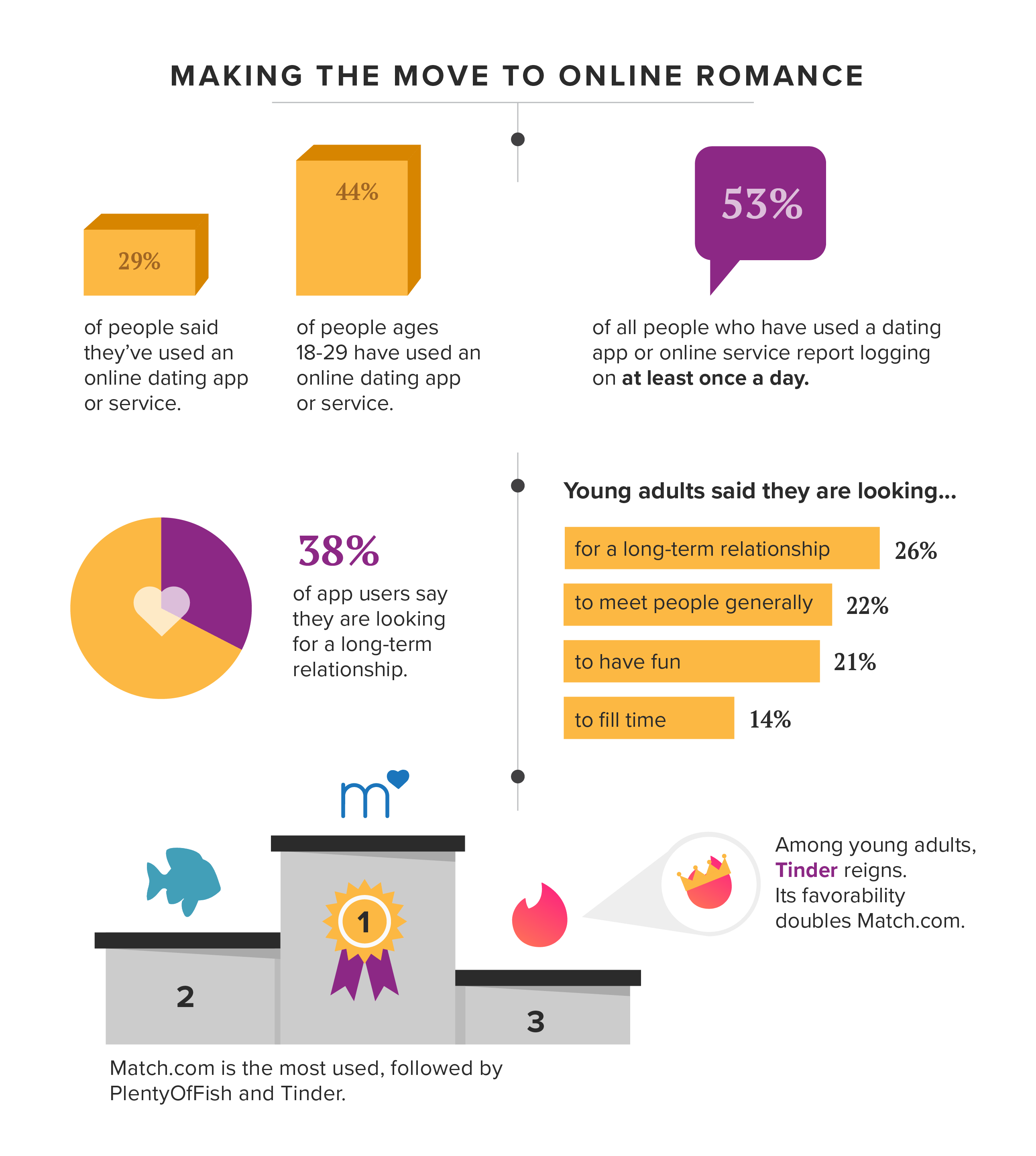 The apps are not just for searching for a happily-ever-after kind of love, although a 38 percent plurality of users say they are looking for a long-term relationship. People using the apps report they’ve had casual romantic encounters but also have forged platonic friendships.