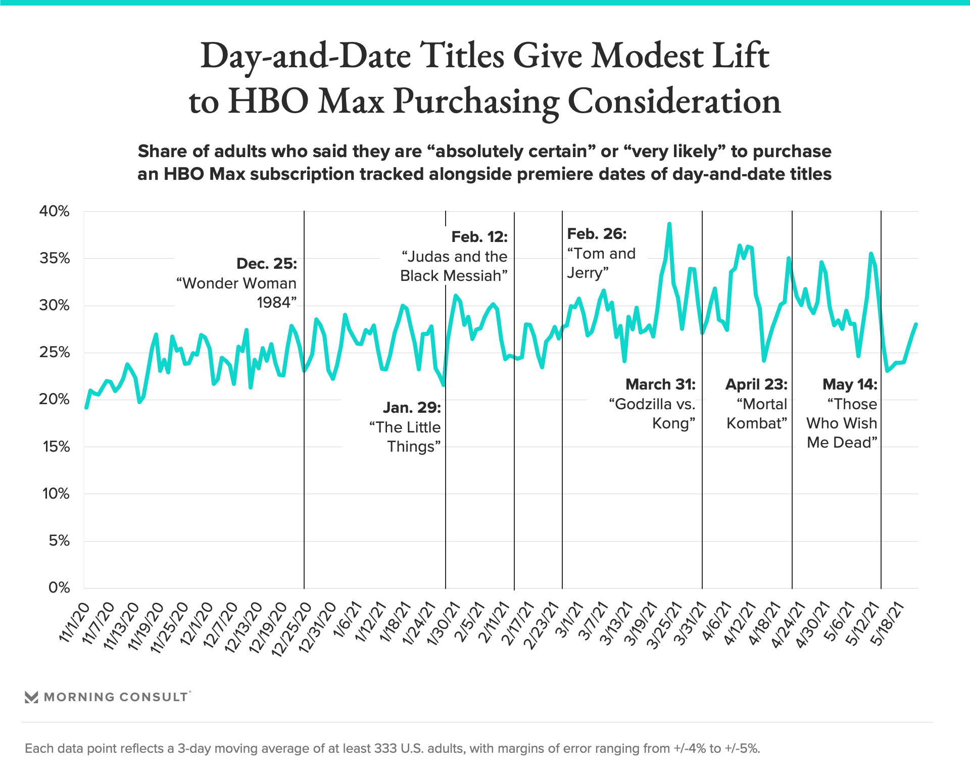 - On average, 30% of adults said they were likely to purchase an HBO Max subscription in the three days before the premiere of a day-and-date title, up from an average of 24% over the past year.