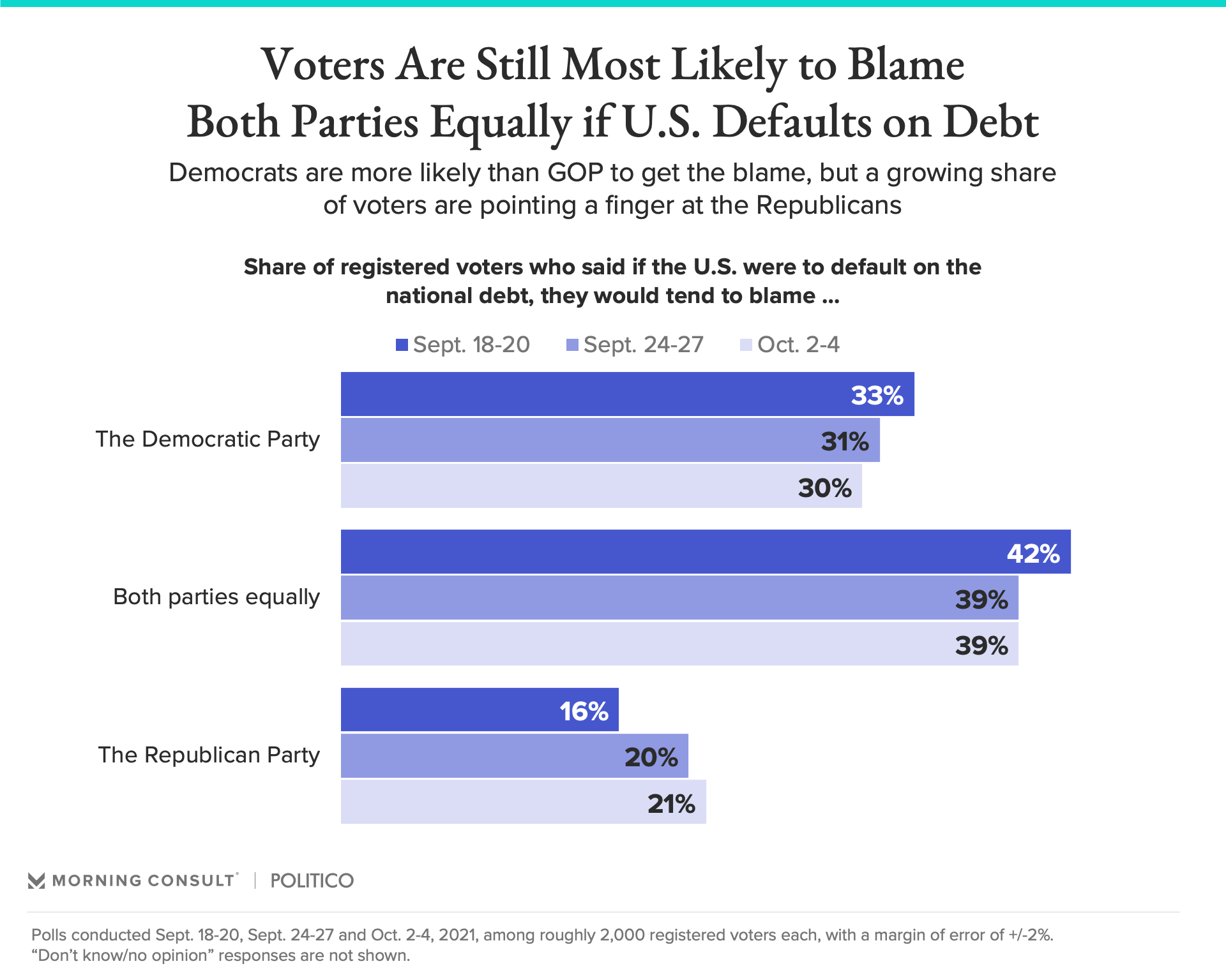 The interparty squabbling is likely an attempt to assign blame if the economic consequences of a debt default hit voters, potentially causing a backlash for the lawmakers they see at fault. So far, a plurality of voters continue to say they would place the blame on both parties equally, followed by Democrats, new Morning Consult/Politico data shows.