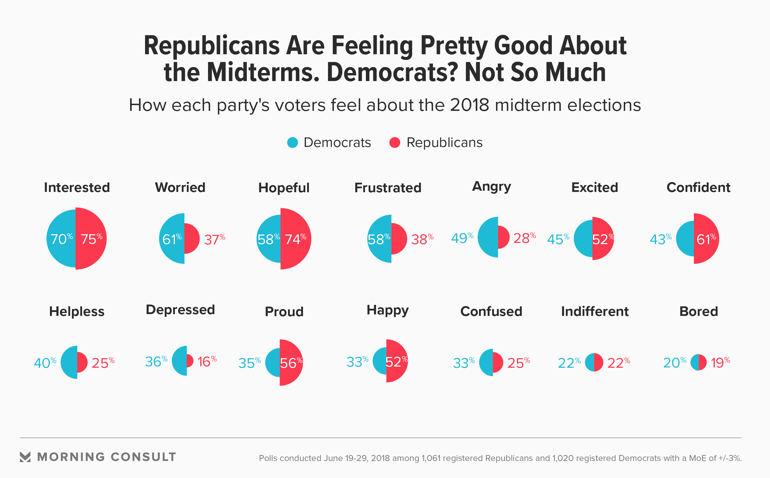 In the Morning Consult surveys, 49 percent of Democrats said they were feeling angry about the midterms, compared with 28 percent of Republicans who reported that emotion. The surveys gauged the attitudes of 1,020 registered Democrats and 1,061 Republicans about the state of their respective political parties. (Crosstabs of Democrats; crosstabs of Republicans.)