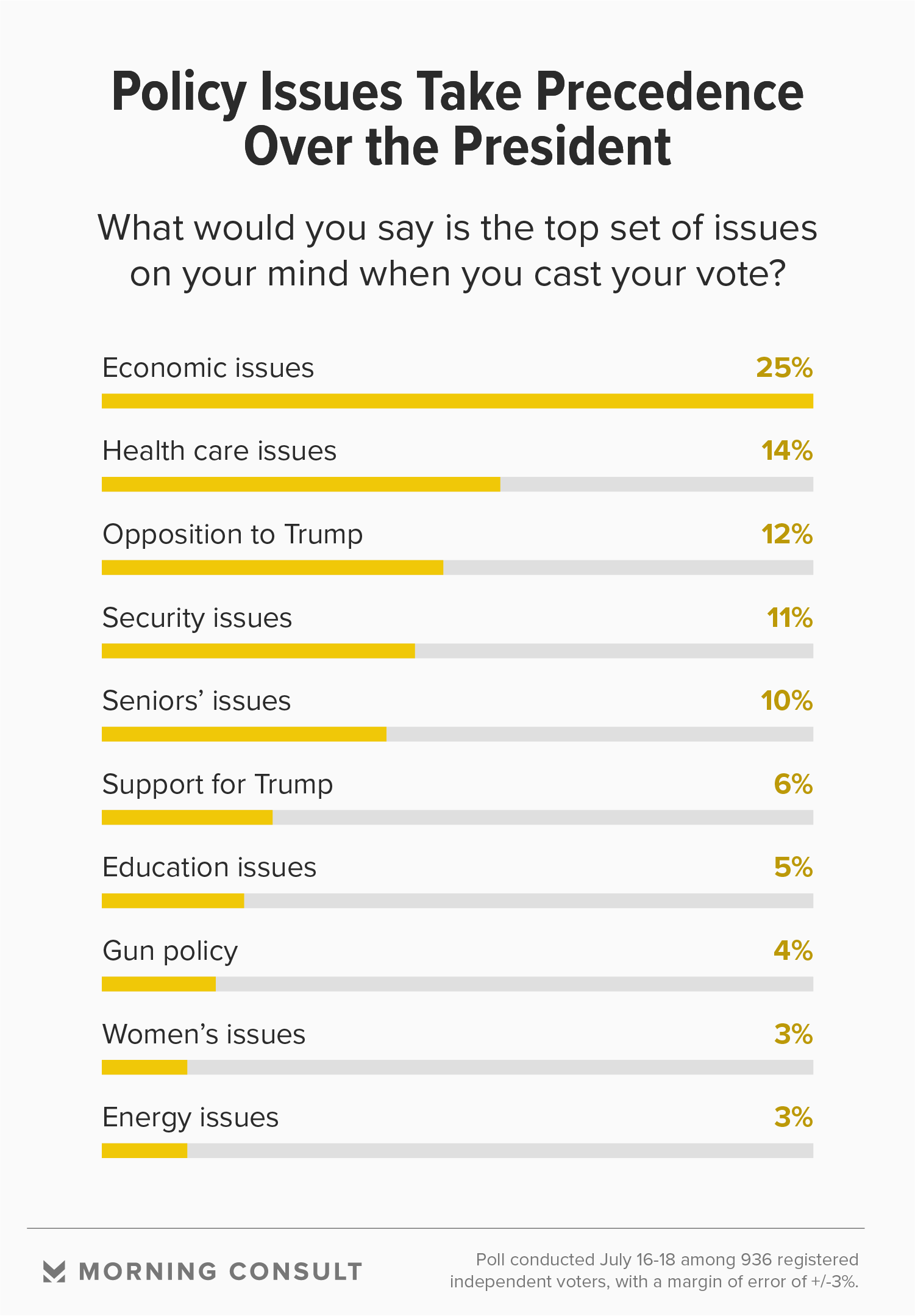 While polling shows Trump to be a prominent influence on partisans’ voting motivation, a significant share of independents are prioritizing “kitchen table issues” such as the economy and health care. In the survey, a quarter of respondents said the economy was their top issue when it came to how they plan to vote in November, followed by 14 percent who opted for health care.