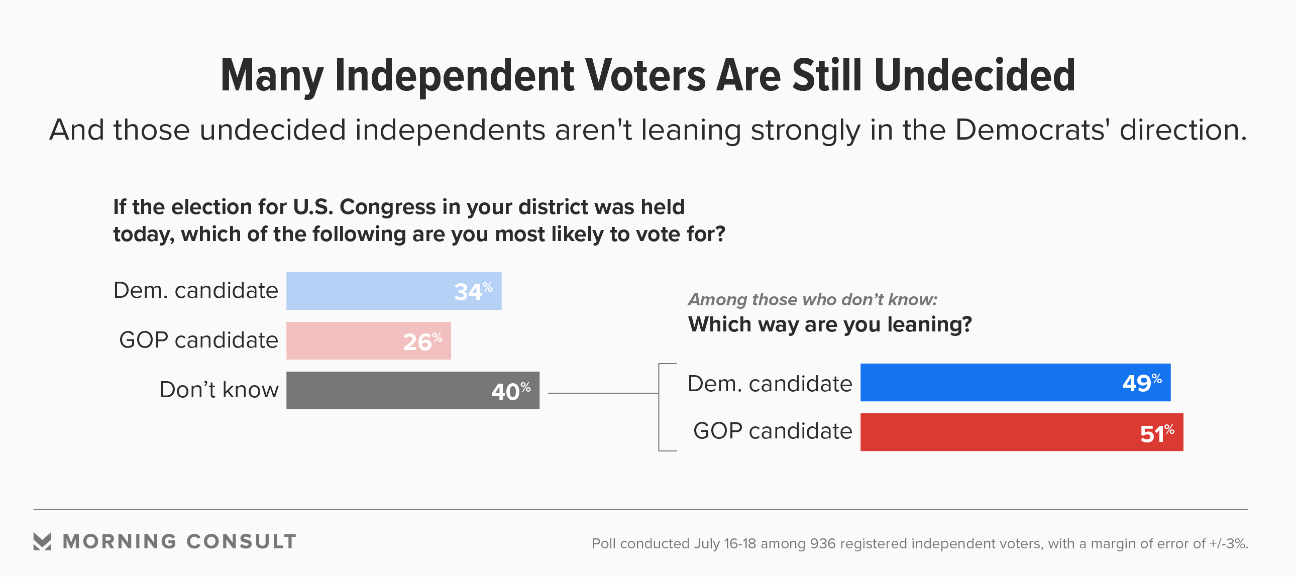 The inaugural edition of Morning Consult’s deep dive into independent voters, based on a July 16-18 survey of 936 respondents, shows Democrats holding an 8 point edge over the GOP on the generic ballot -- a positive sign as the party seeks to pick up 23 House seats and flip two Senate seats to take the reins in both chambers.
