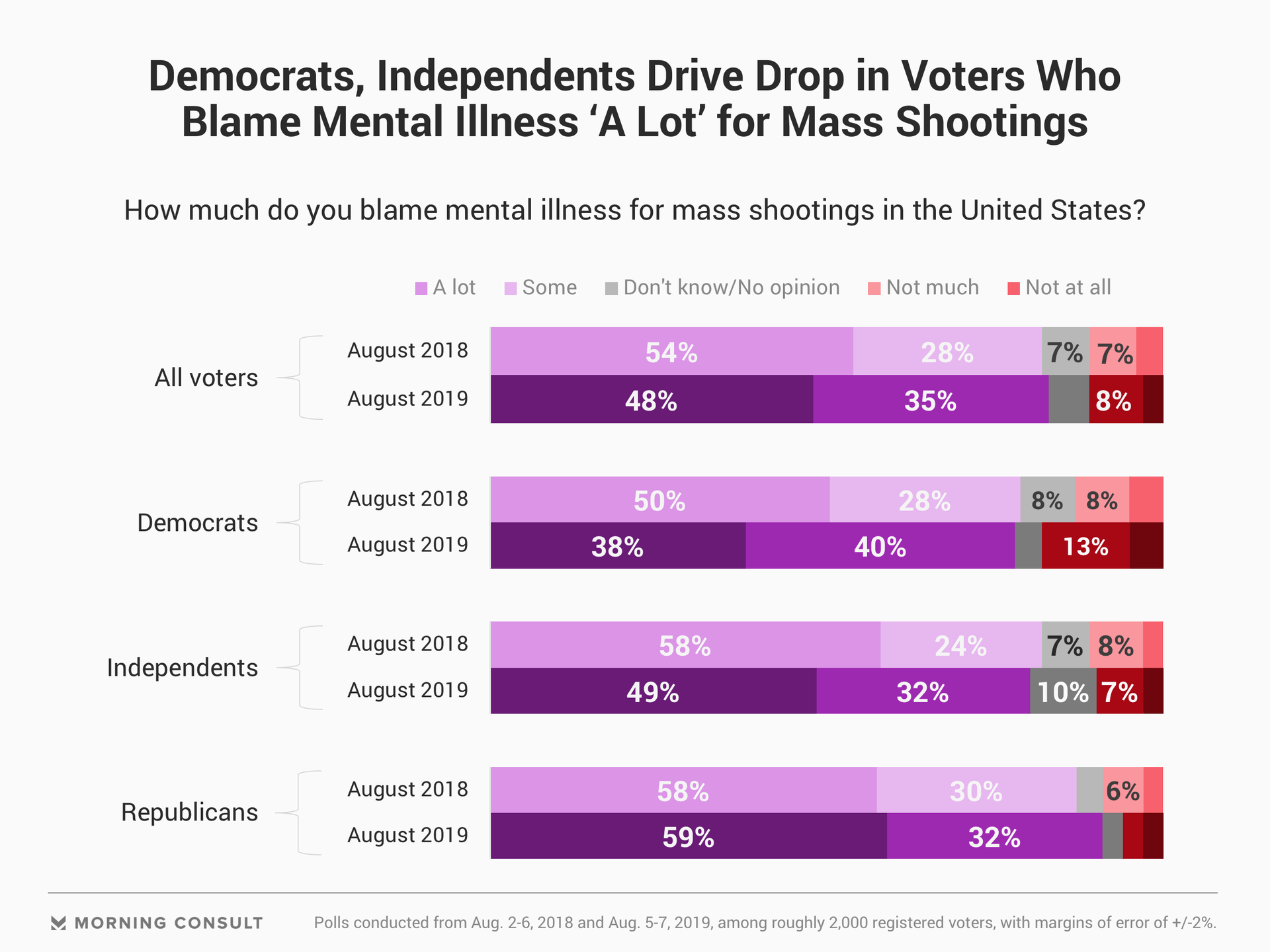 - 48% of voters place “a lot” of blame on mental illness, from 54% a year ago.