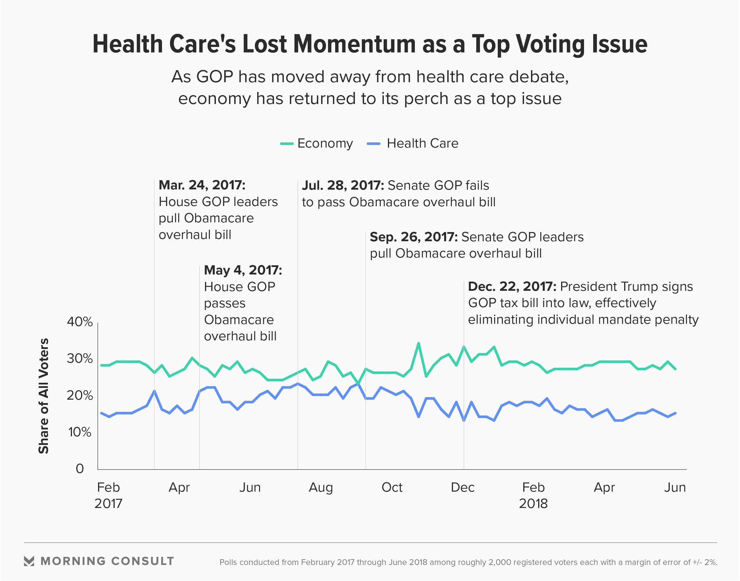 - Health care has fallen as a top issue for voters since GOP abandoned Obamacare overhaul.