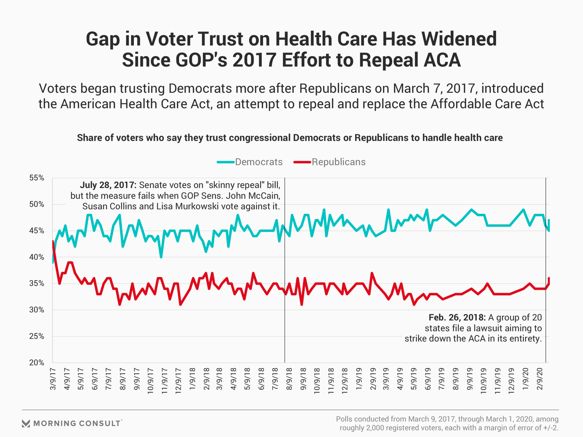 Fifty-six percent of voters attribute the current state of the ACA to Obama, even though the Trump administration has made significant changes to it, such as allowing states to impose work requirements for Medicaid, ending cost-sharing reduction subsidies to insurers and slashing funds to advertise Healthcare.gov signups. This leaves the overall sustainability of the law in question.