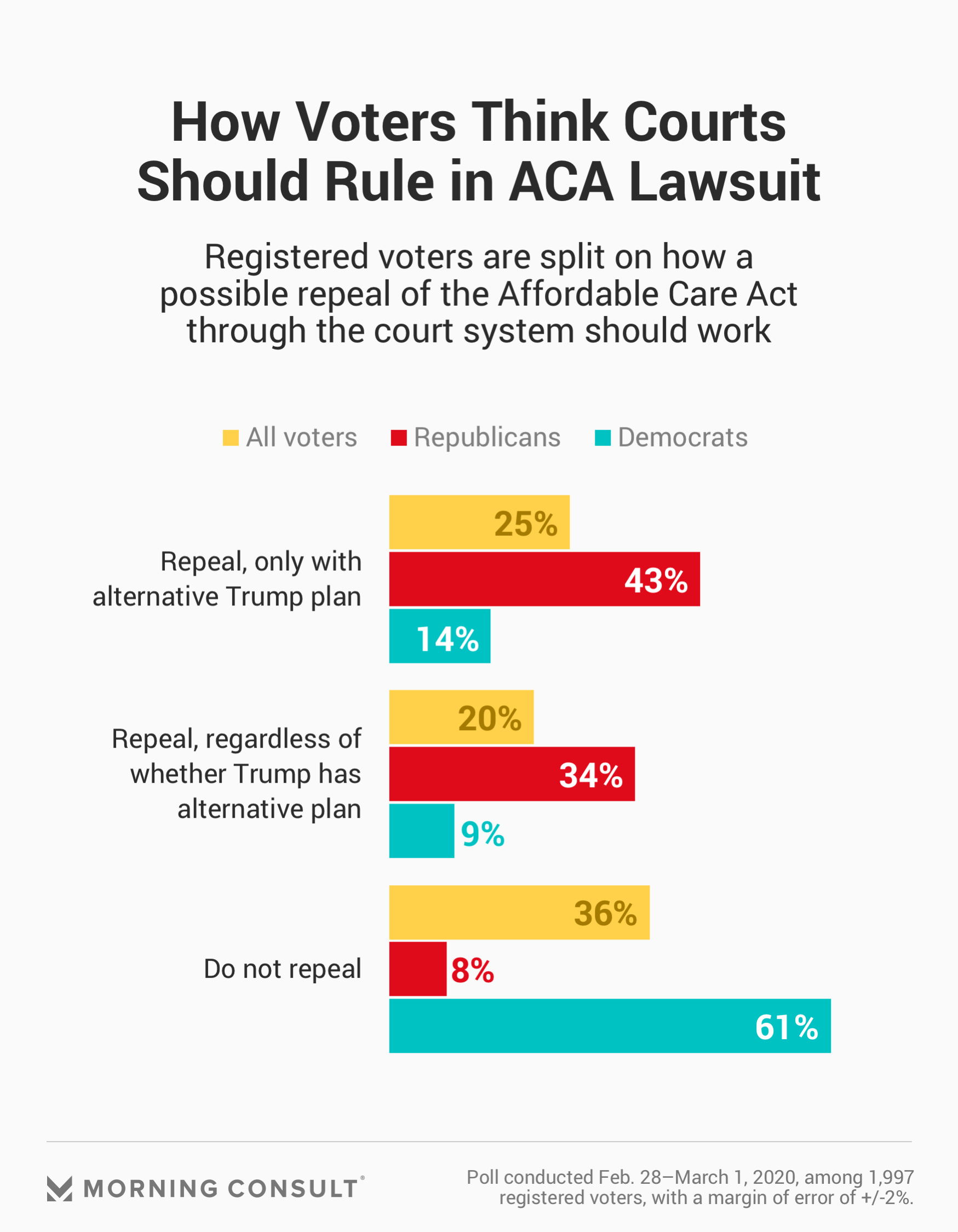 The Supreme Court agreed earlier this month to hear Texas v. United States, a lawsuit brought by a coalition of Republican governors and attorneys general alleging the deactivated individual mandate is unconstitutional, and not severable from the rest of the law. A 36 percent plurality of voters think the courts should not repeal the ACA, but it’s a highly partisan issue: Sixty-one percent of Democrats are against repeal through the court system, versus only 8 percent of Republicans.