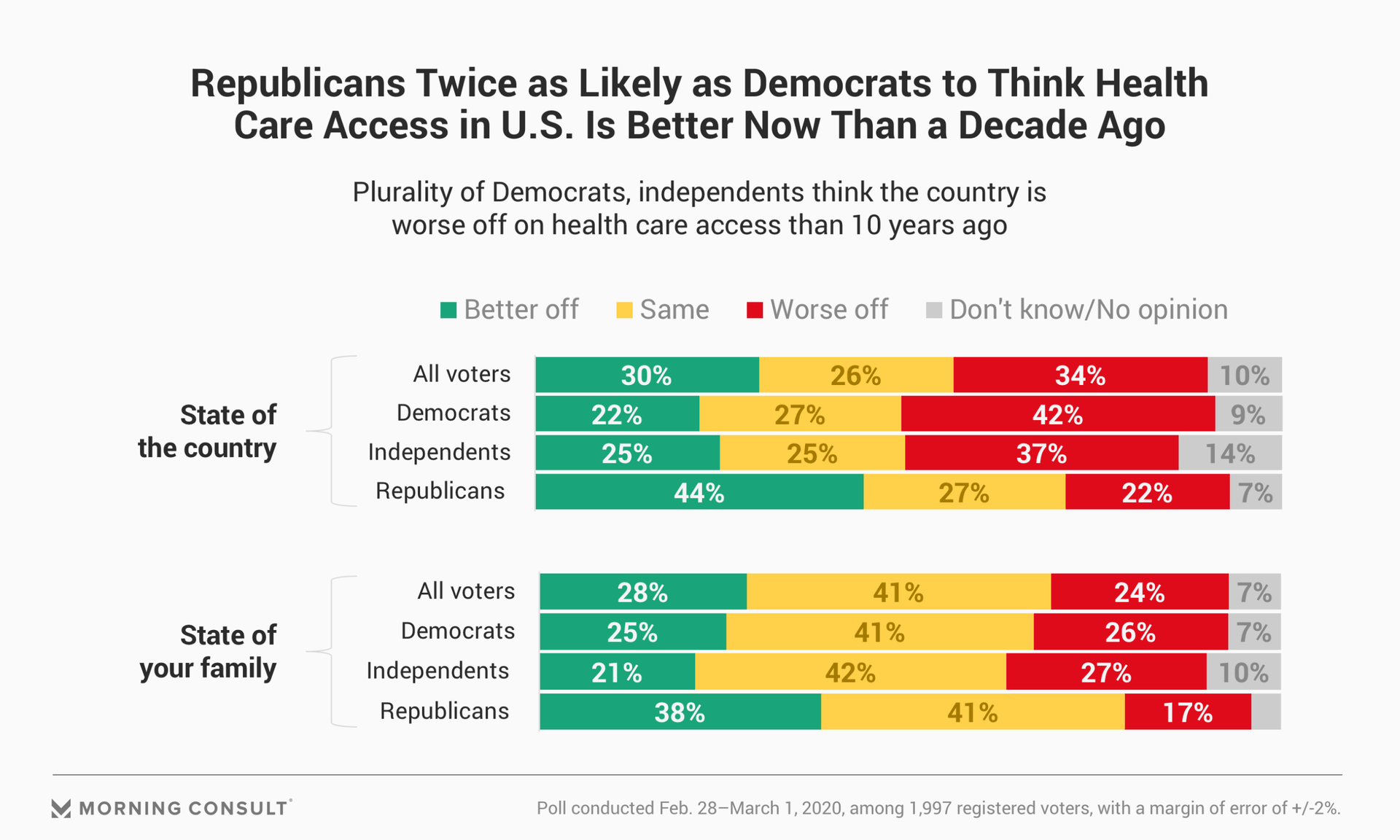 Even though the ACA is hailed as a Democratic achievement, with widespread liberal support, Democrats are more likely than GOP voters to be pessimistic about the state of health care access in the country 10 years later: Forty-two percent of Democrats believe the country is worse off than it was 10 years ago, compared to 22 percent of Republicans. Additionally, 38 percent of Republicans think access for their own family has improved, compared to 25 percent of Democrats.