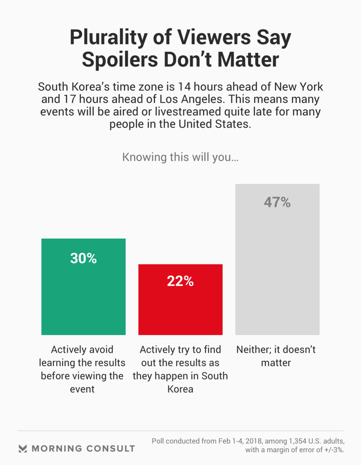 In a Feb. 1-4 Morning Consult poll, conducted among 2,201 U.S. adults, 62 percent, or 1,354 people, said they were very or somewhat likely to watch the games. The margin of error for the overall poll is plus or minus 2 percentage points.