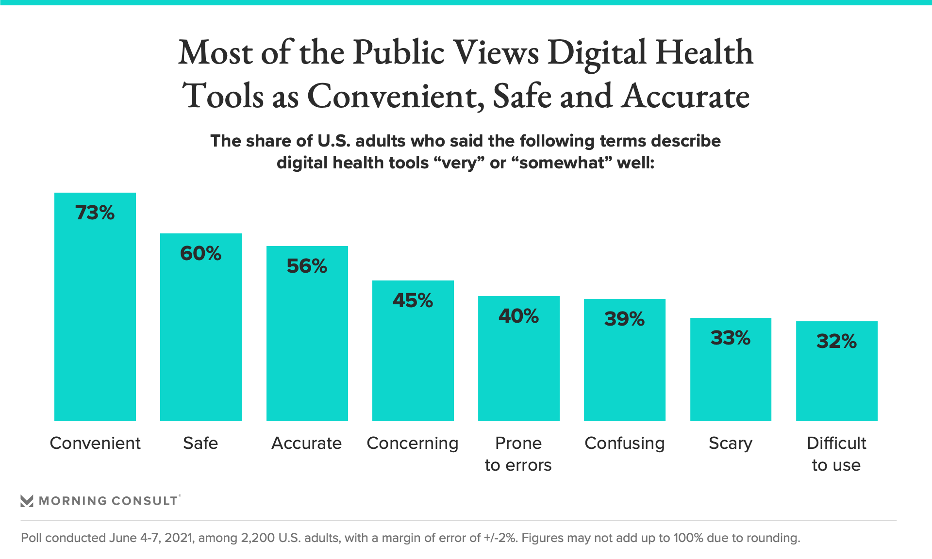 73% of U.S. adults described digital health tools as convenient, while 60% said they are safe and 56% said they are accurate.
