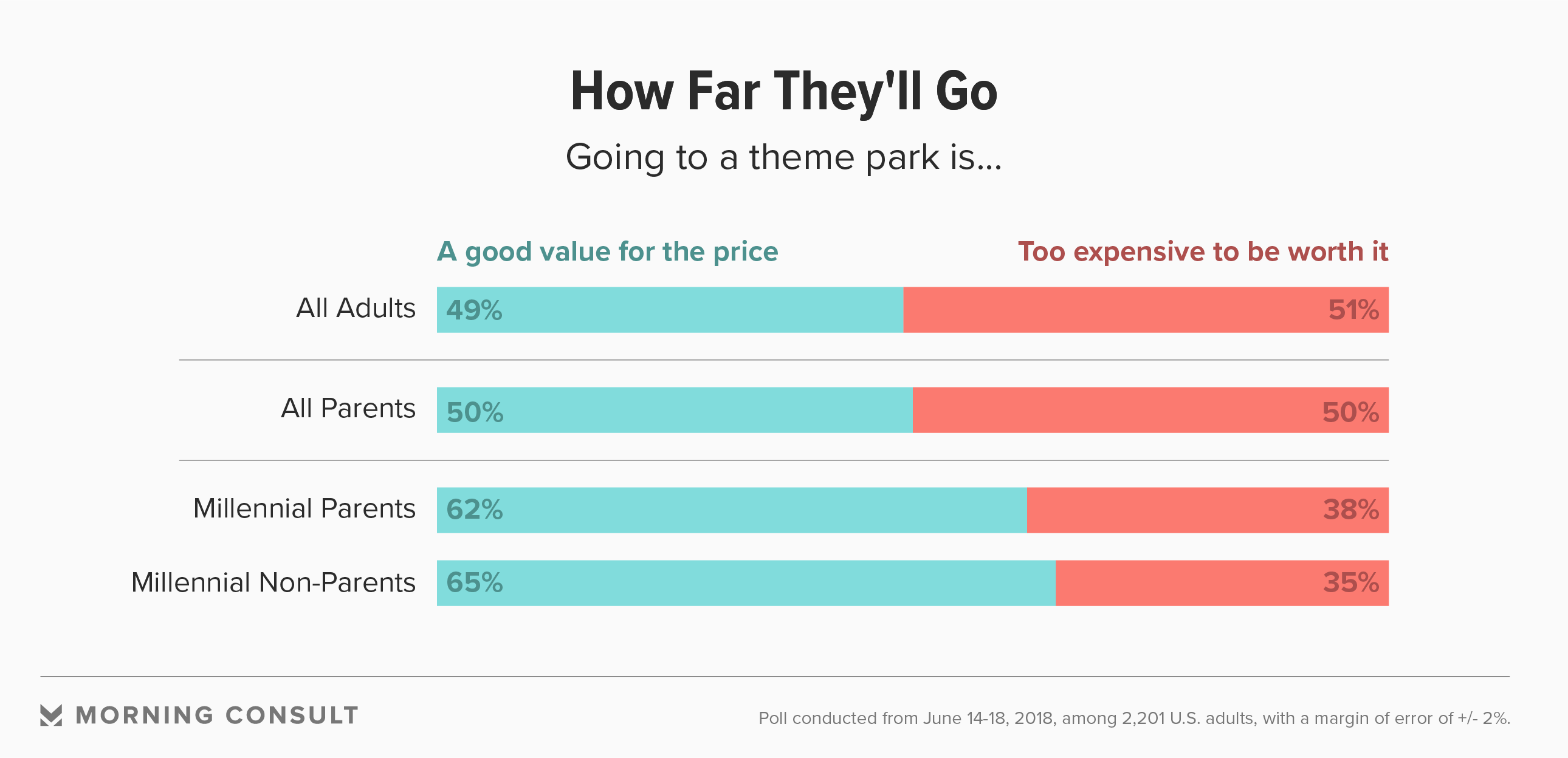 They're also more likely to rationalize the cost: 62% of millennial parents and 65% of childless millennials say a theme park is a good value for the price, compared to 50% of all parents.