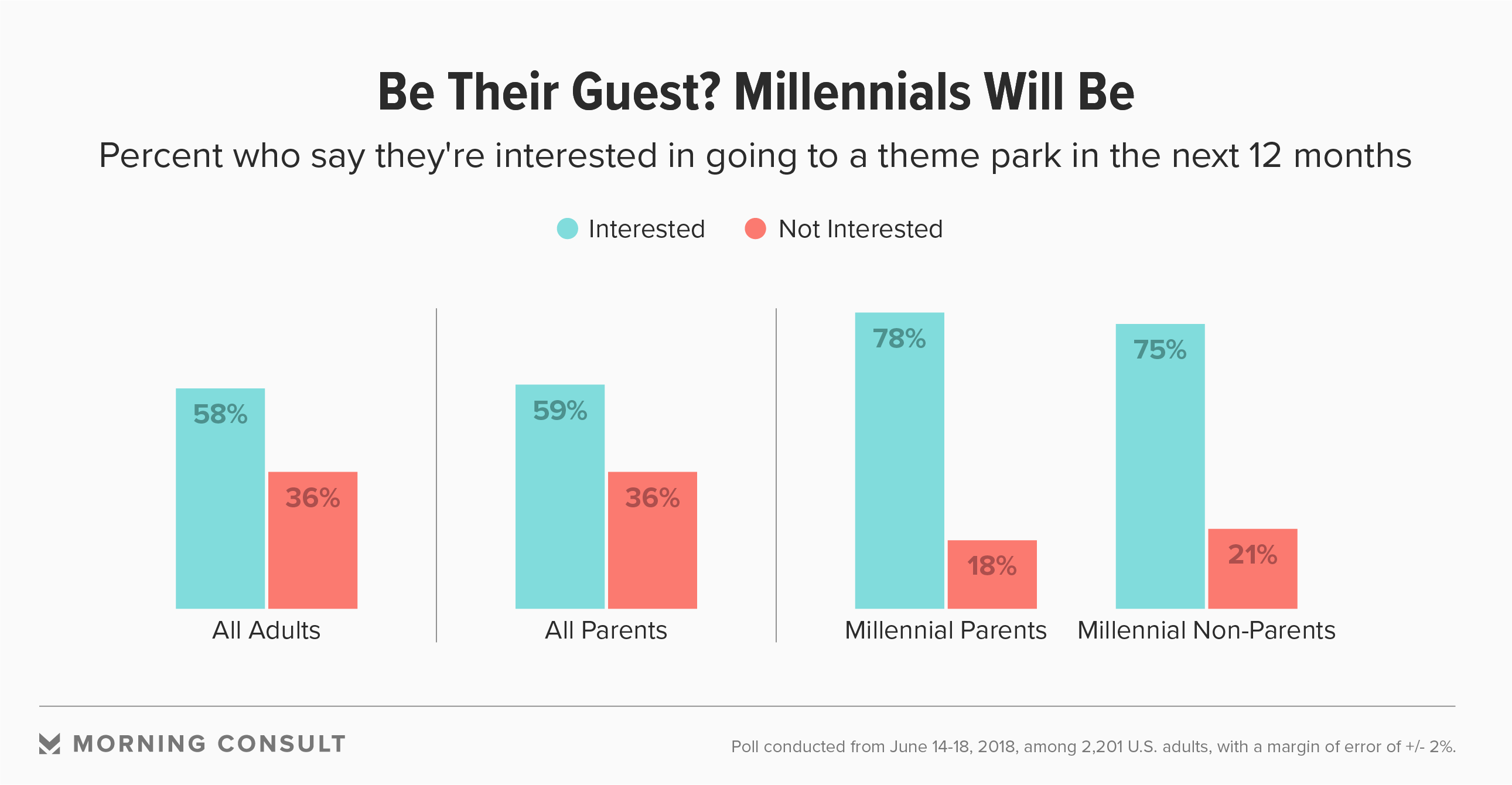 Millennial parents were more likely than other parents to say they’re interested in going to a theme park in the next year: 78 percent versus 59 percent, according to the Morning Consult survey of 2,201 U.S. adults from June 14-18.