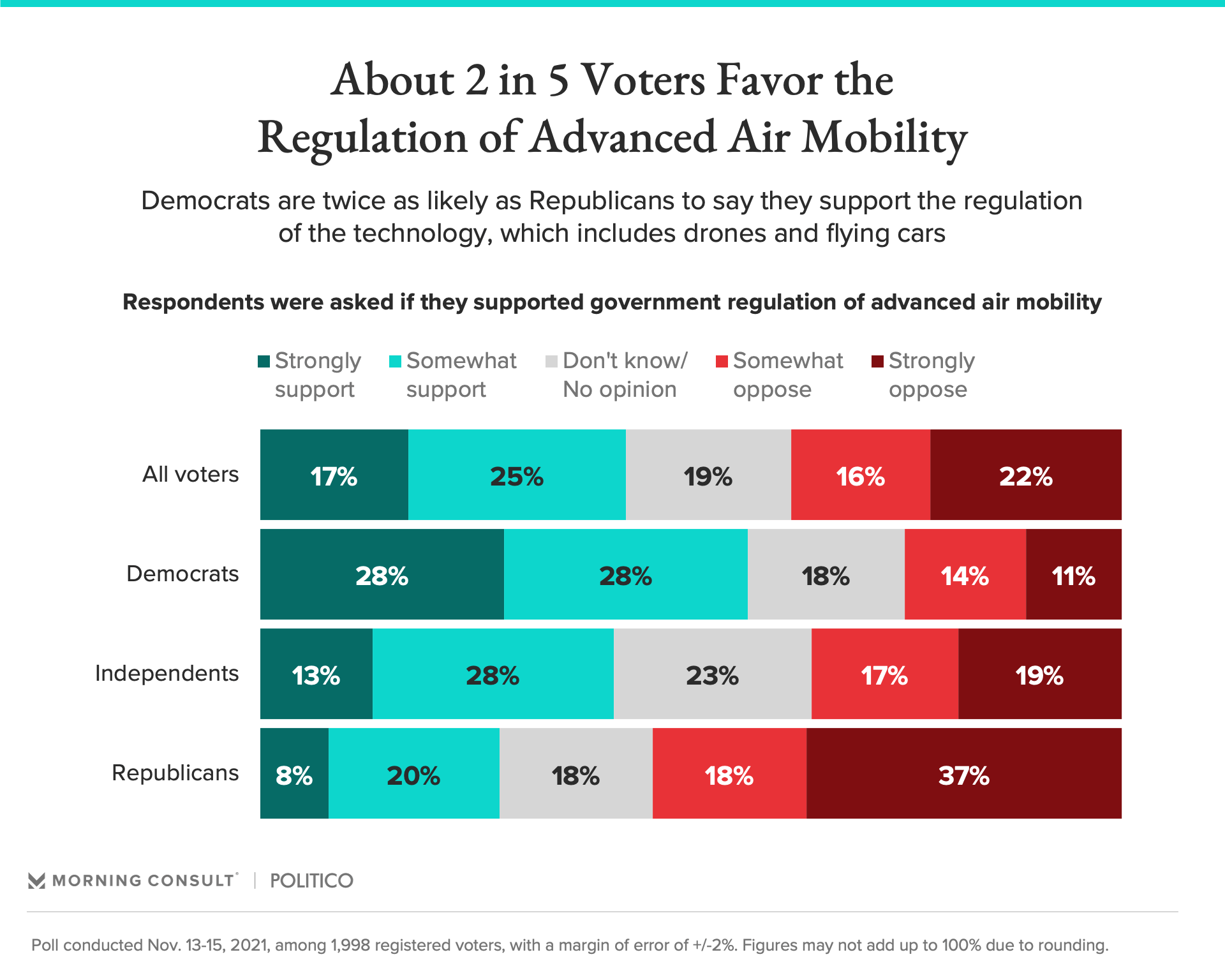 - Forty-two percent of all voters said they supported the regulation of the technology. Fifty-six percent of Democrats said they favored regulations on advanced air mobility, compared to just 28 percent of Republicans and 41 percent of independents.