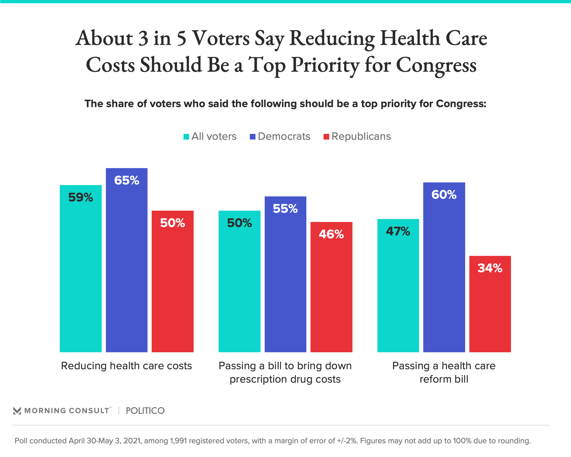50% of voters, including 55% of Democrats and 46% of Republicans, said passing legislation to lower drug costs should be a top priority for Congress.