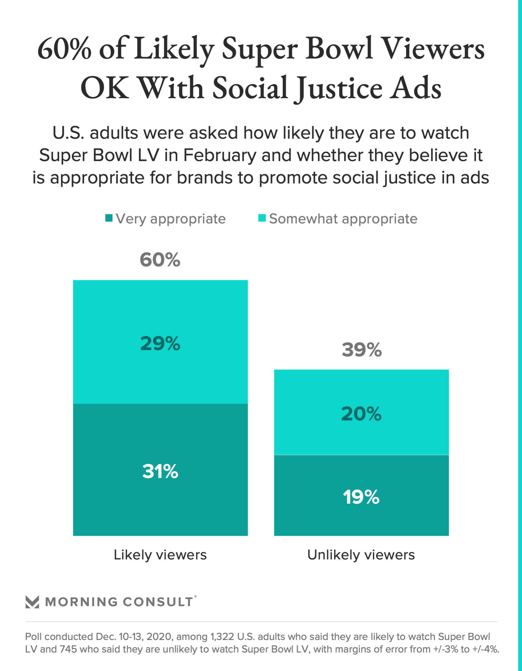 - Of those expecting to tune in, 60% said the big game is an appropriate platform for brands to promote social justice.