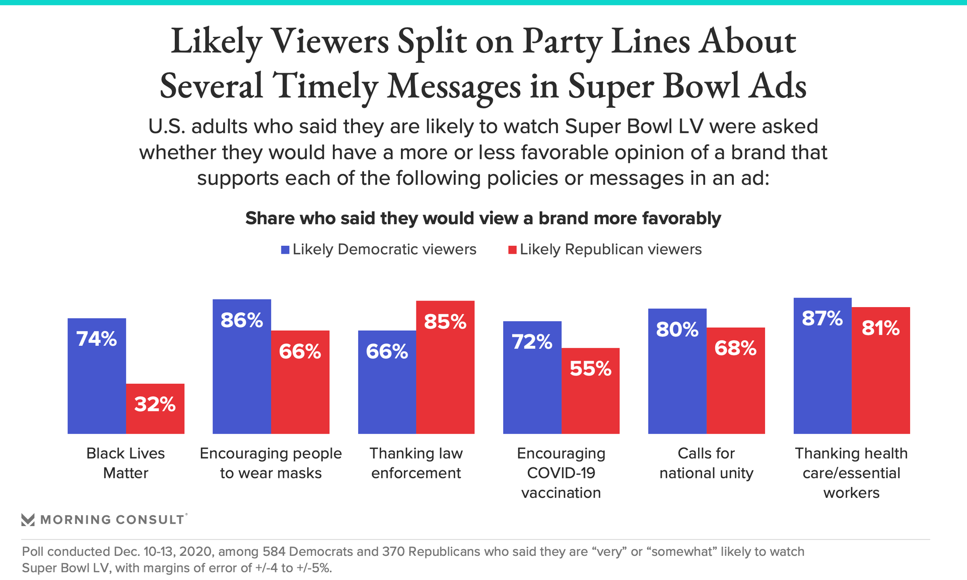 While the pandemic has been portrayed as a politically polarizing issue, the majority of likely Super Bowl viewers said they would view brands that address certain aspects of it more favorably.