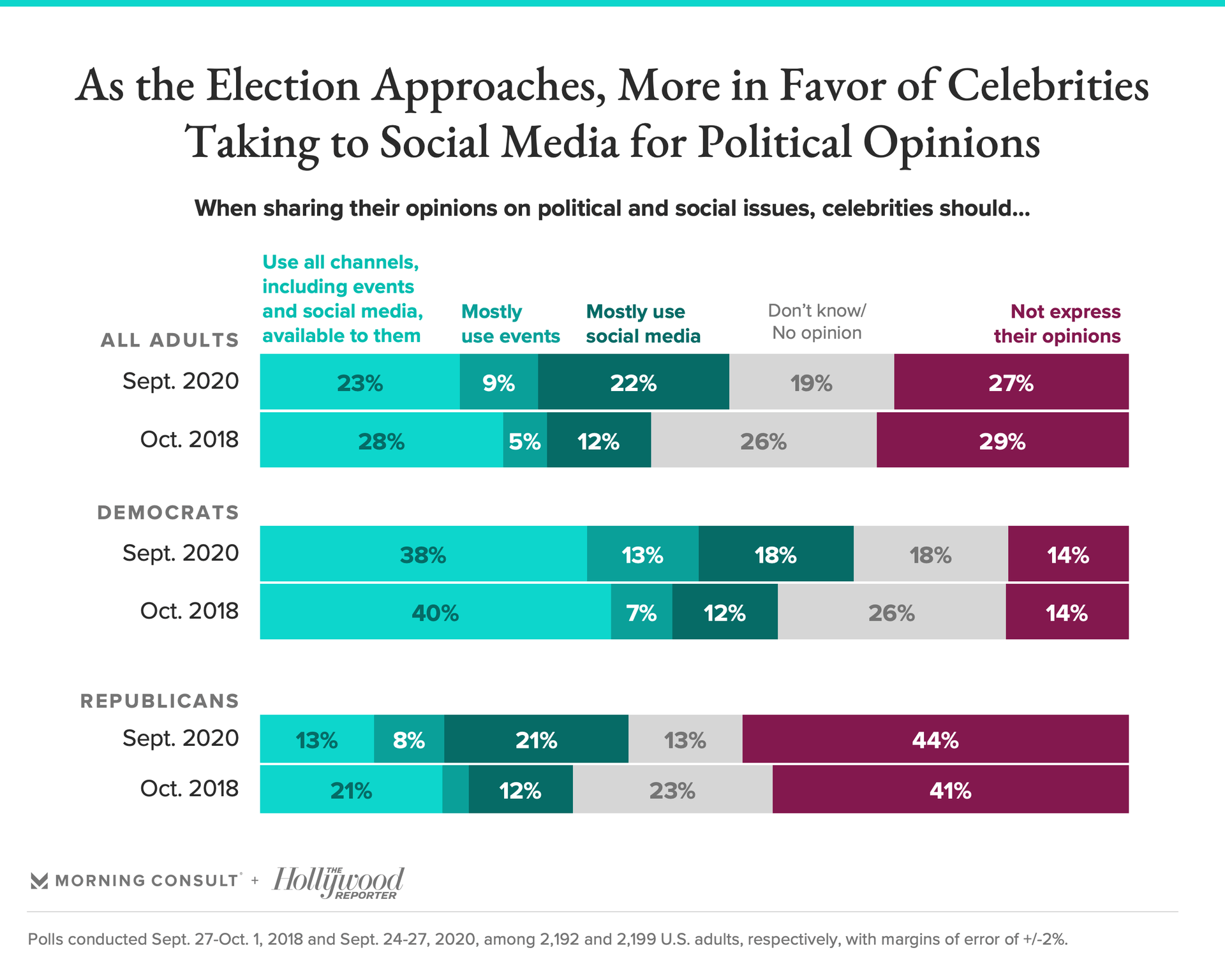 As Election Day approaches, more of the public believes celebrities should use all channels available to them to speak out on social and political issues than it did shortly before the 2018 midterm election, per a new Morning Consult/The Hollywood Reporter poll. And regardless of party lines, Americans said that encouraging people to vote, along with voter registration, is the most appropriate issue for stars to tackle.
