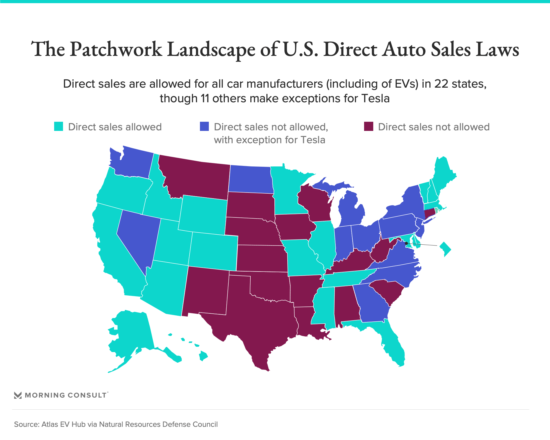 The company’s efforts have further complicated the existing landscape of state laws: While 22 states allow direct sales for all, the negotiations have resulted in Tesla-only exemptions in 11 others. As several newer EV manufacturers prepare to bring their own models to market, those one-company exemptions have proved pesky.