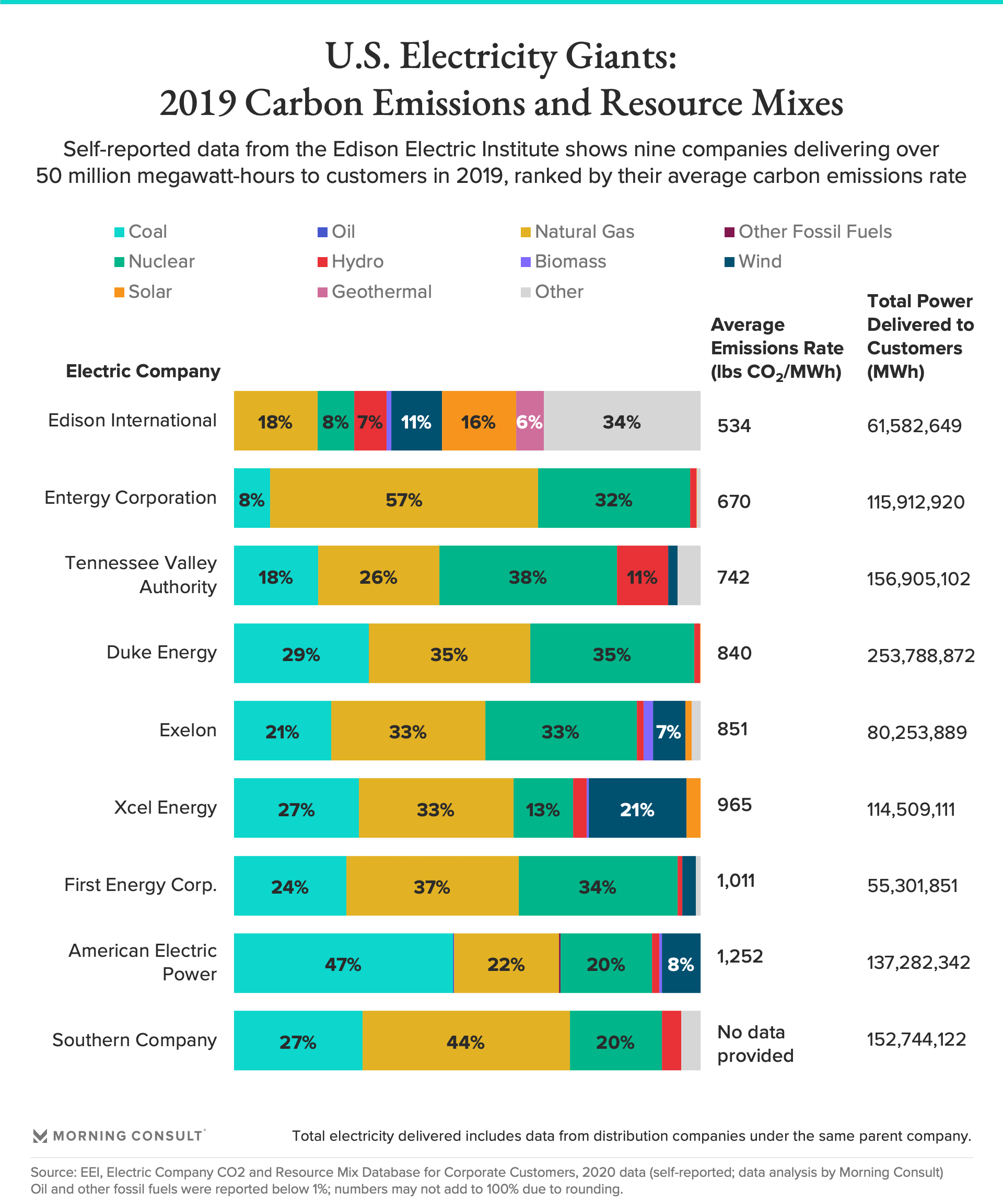 The data includes carbon emissions intensity rates for each distribution company both with and without accounting for renewable energy certificates; Morning Consult’s analysis relied on the former. The analysis also combined delivered electricity numbers across the subsidiary distribution companies in order to get a more accurate picture of the parent company as a whole.