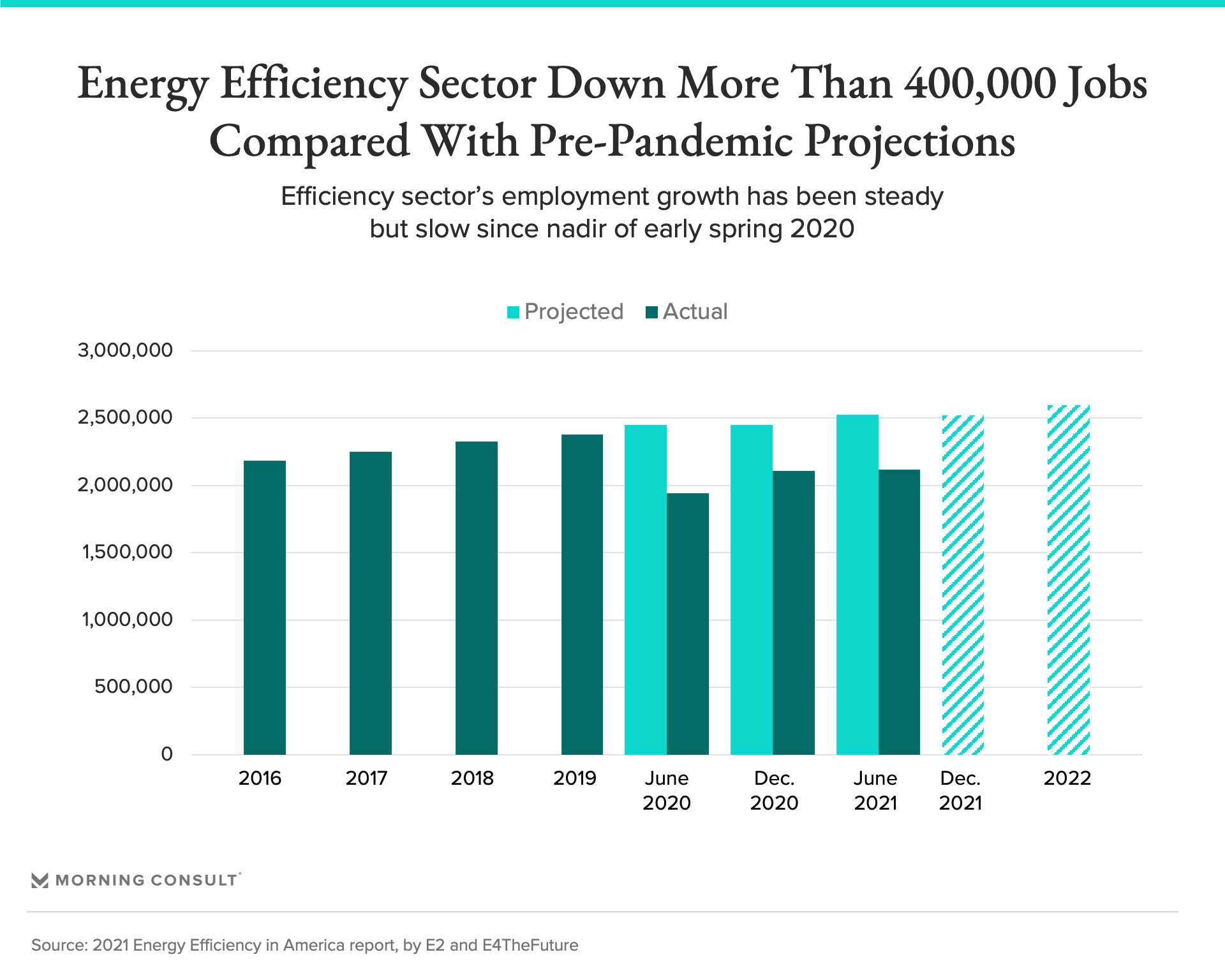 More than a year since the onset of the coronavirus pandemic, the energy efficiency sector is still weathering its impacts, with employment numbers significantly below pre-pandemic projections, according to a new report shared exclusively with Morning Consult.