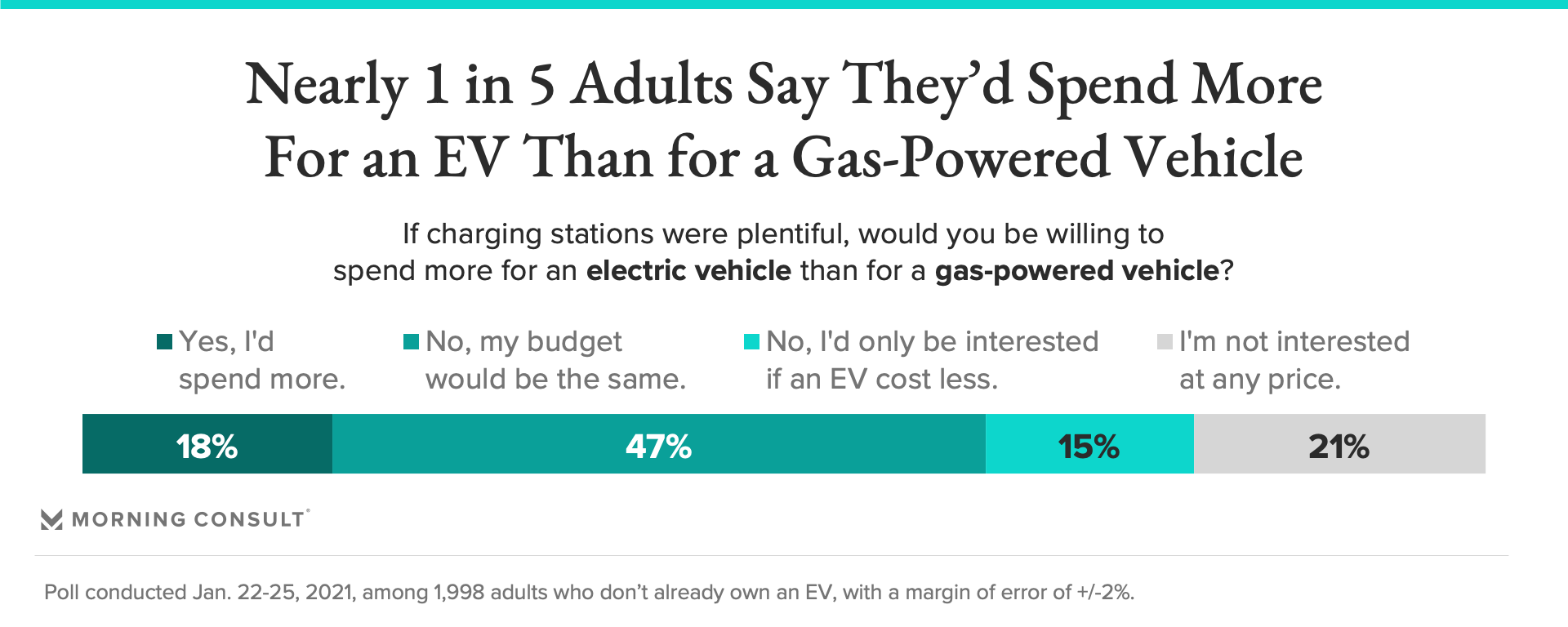 According to a new Morning Consult survey, 47 percent of U.S. adults who don’t already own an electric vehicle said their budget would be the same for an EV as it would be for a conventional vehicle; just 18 percent said they would be willing to spend more.