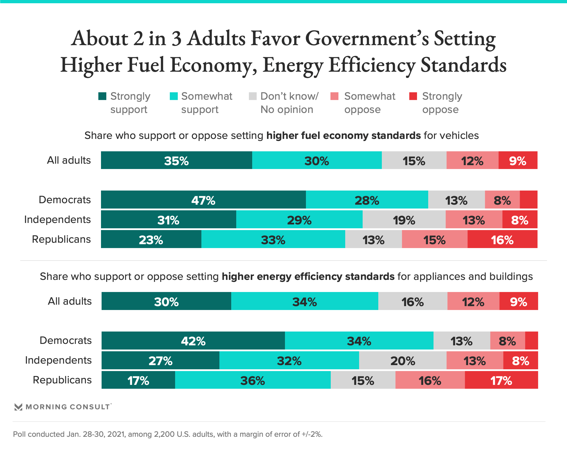 A poll conducted Jan. 28-30 found that nearly 2 in 3 U.S. adults support both setting higher fuel economy standards for cars and trucks and establishing stricter energy efficiency standards for appliances and buildings. And while Democrats back the policy propositions more strongly than their Republican counterparts, there is majority support across the board.