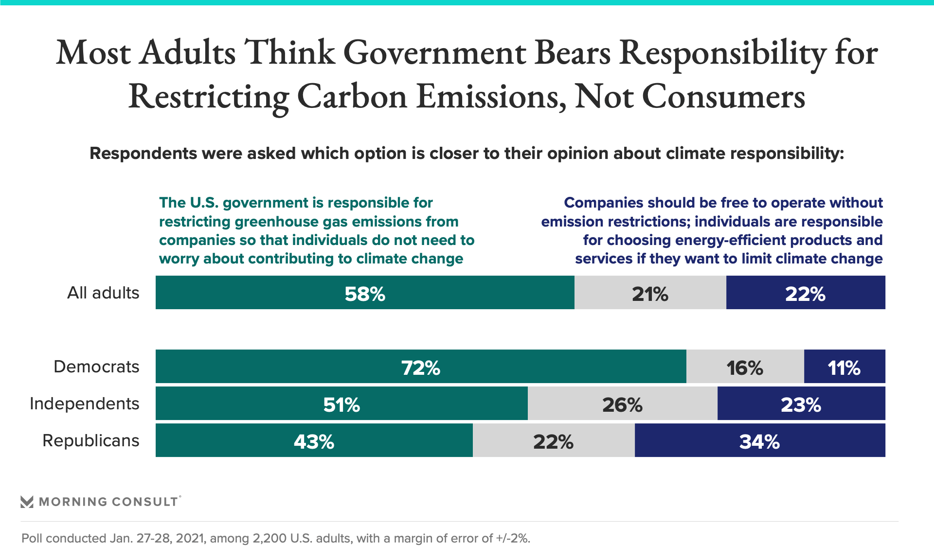 This faith, or lack thereof, is complicated by differing philosophies on who bears the responsibility for taking action on climate change. A separate Morning Consult survey, conducted Jan. 27-28, found that 58 percent of adults agree with the view that the government is responsible for passing laws and implementing policies restricting greenhouse gas emissions so that individuals do not have to worry too much about their own emissions.