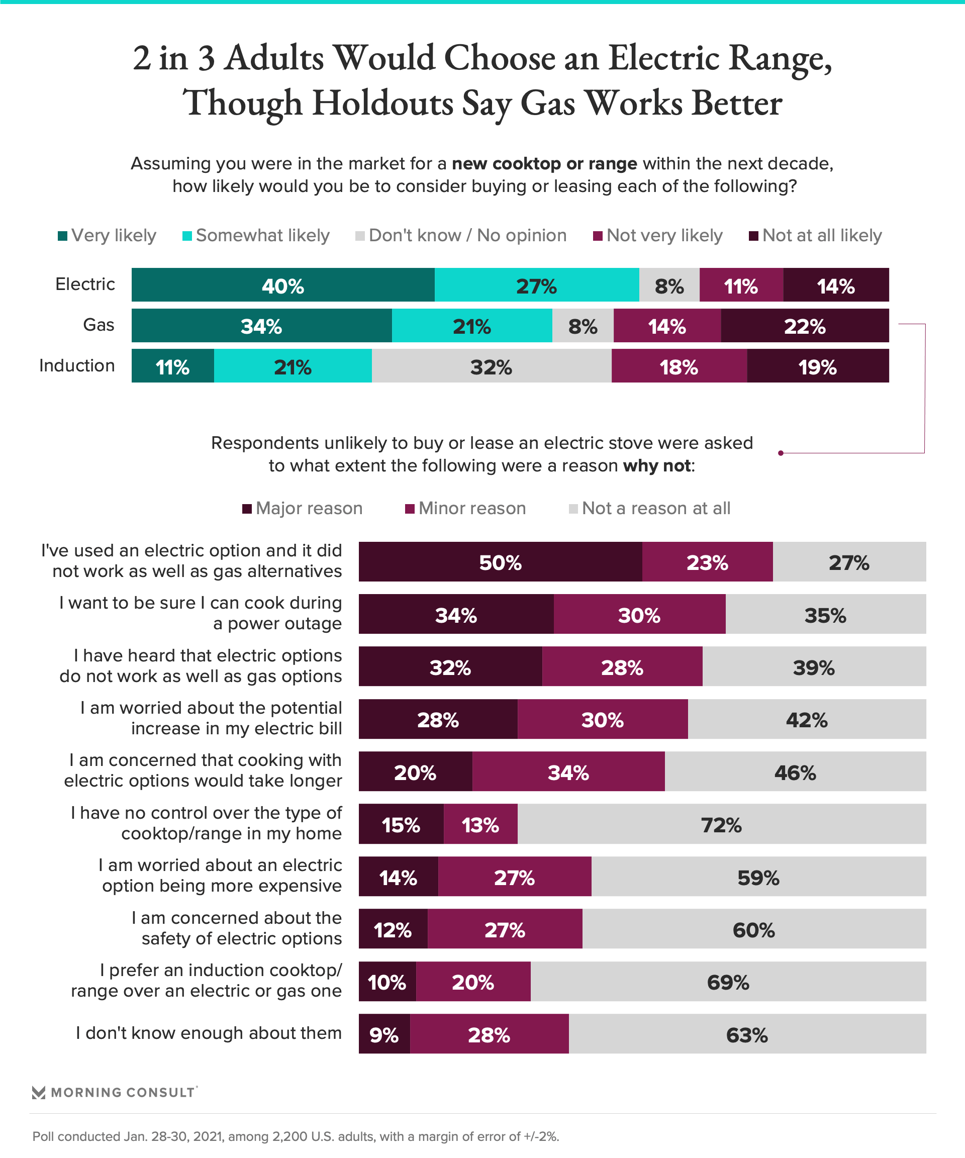 Indeed, half of the electric stove-skeptical respondents said a major reason for their reluctance is that they have tried using non-gas options and found that they simply do not work as well. And more than 1 in 3 cited concern over not being able to use their stove during a power outage.
