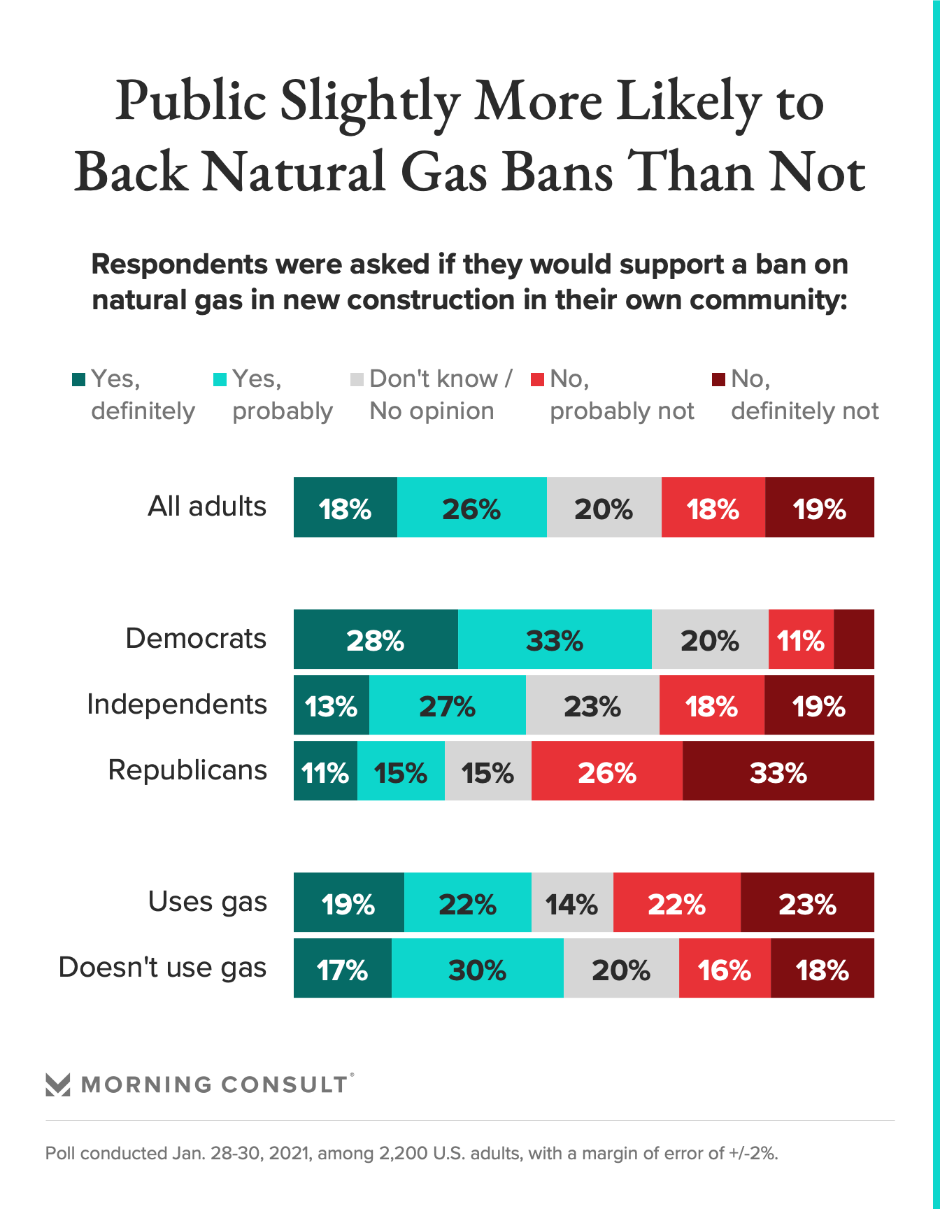 And while those who currently use natural gas to heat their homes were less likely to support the potential bans than those who do not, the margin was similarly small, at 41 percent and 47 percent, respectively.