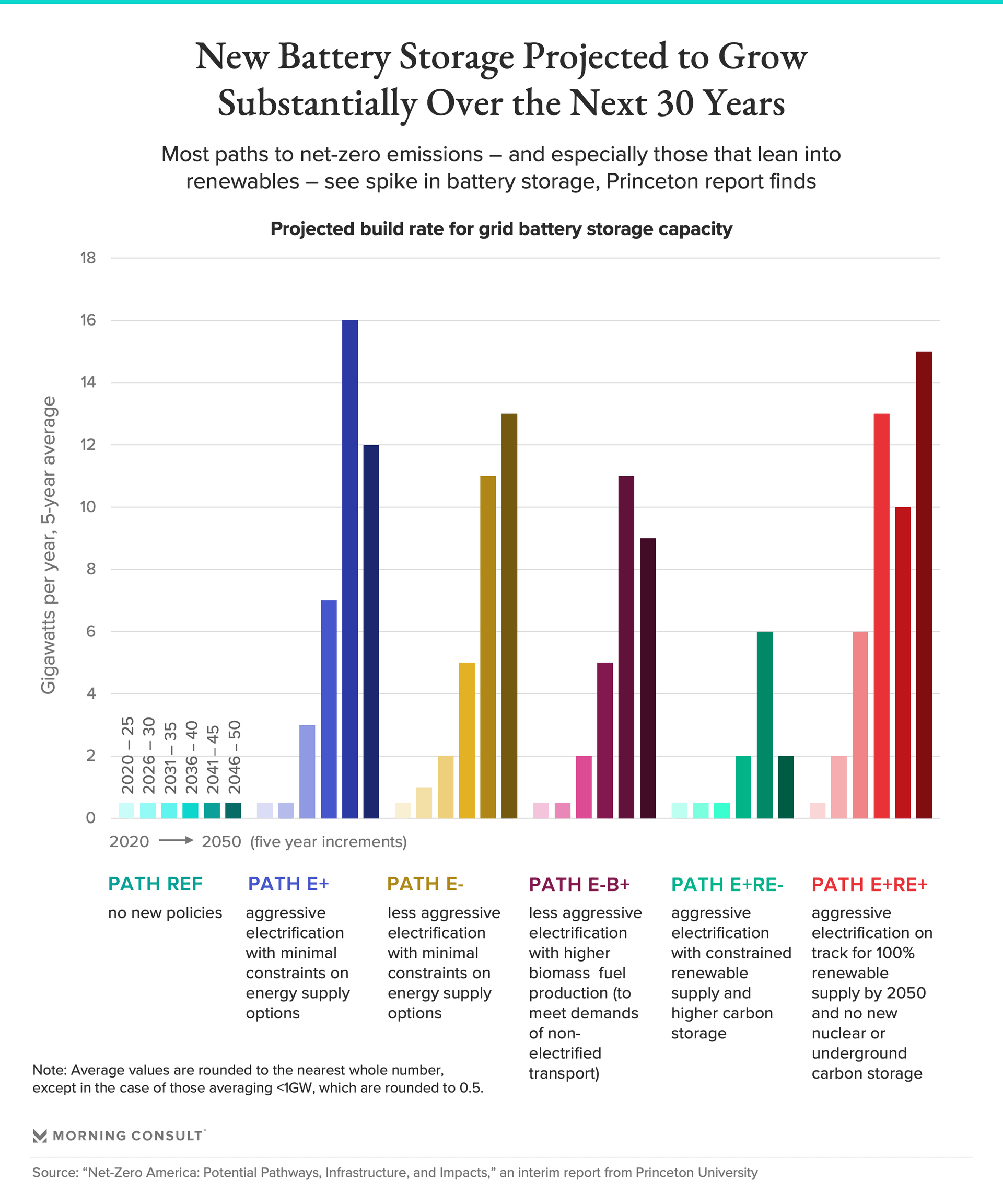 This comes as a new report from Princeton University suggests that a surge in battery storage capacity in the United States will be an inevitable consequence of all potential paths to a net-zero economy, aside from one projecting no change from current policies (Path REF).