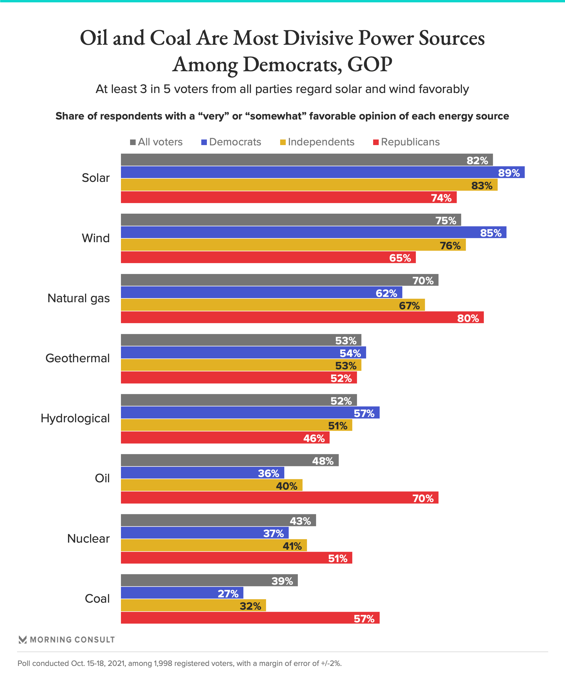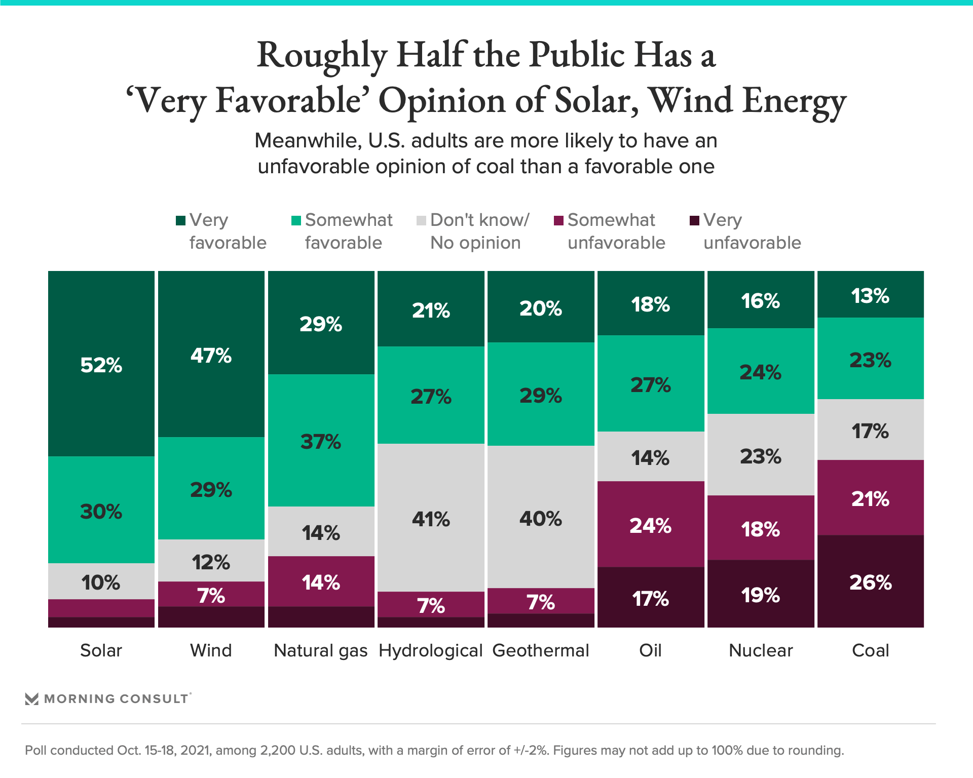 As the U.S. delegation to COP26 in Glasgow next week -- and lawmakers at home -- contemplate the specifics of the country’s energy and emissions commitments, the latest data from Morning Consult’s ongoing Taking the Temperature project found that the public has an overwhelmingly positive opinion of zero-emissions sources like solar and wind, with natural gas (a fossil fuel) close behind.