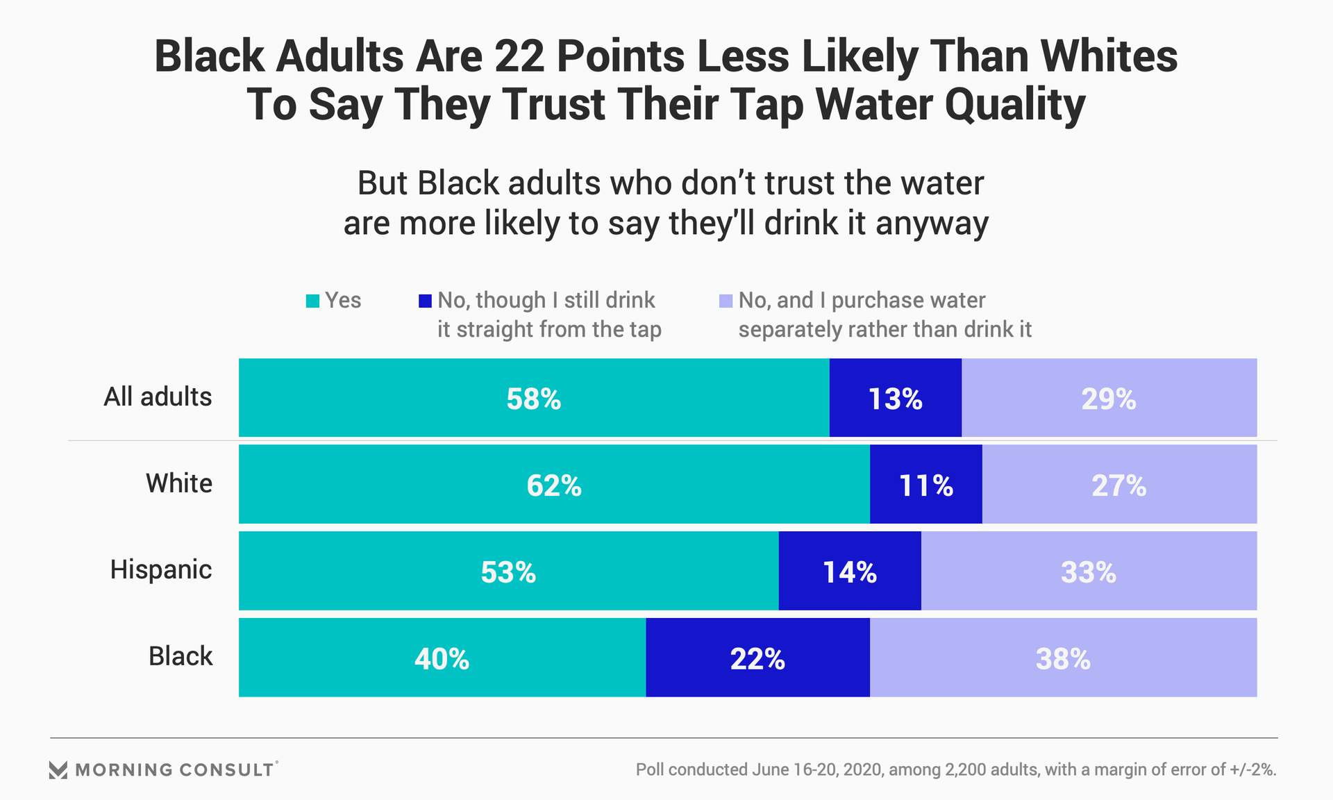 And this awareness extends to the quality of their water. Another poll conducted June 16-20 of 2,200 adults found a 22-point gap between white and Black respondents concerning trust in the quality of their tap water — 62 percent and 40 percent, respectively — while Hispanics (53 percent) split the difference. Thirty-eight percent of Black respondents and 33 percent of Hispanics said they purchase water separately rather than drinking what comes out of the tap, compared with 27 percent of whites.