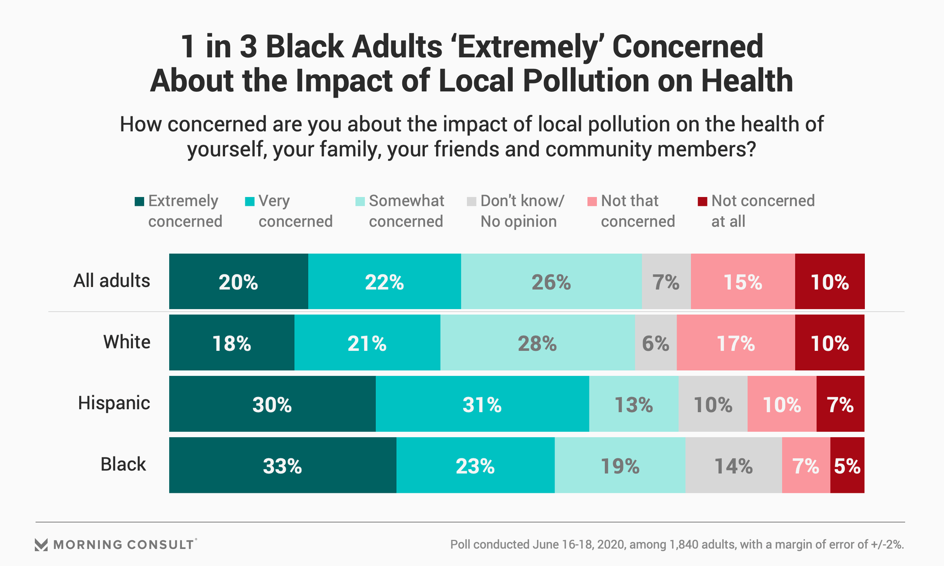 In a poll conducted June 16-18 among 1,840 adults, 61 percent of Hispanic adults and 56 percent of Black adults said they’re “very” or “extremely” concerned about the impact of local pollution on themselves and their family, friends and community members, compared to 39 percent of white adults who said the same. In comparison, 27 percent of white adults, 17 percent of Hispanic adults and 12 percent of Black adults said they were “not that concerned” or “not at all concerned” about local pollution.