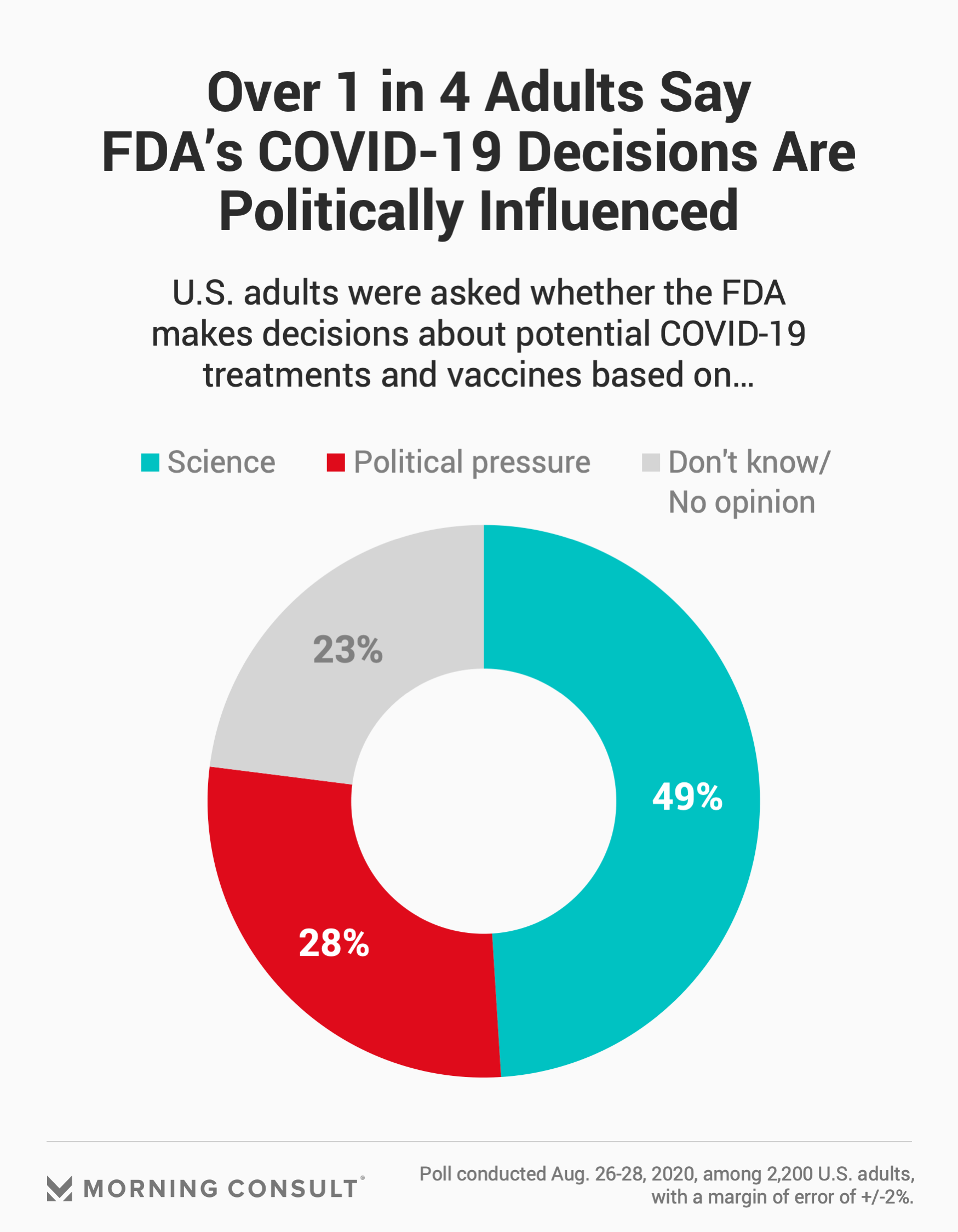 As the Food and Drug Administration finds itself embroiled in controversy over its handling of a newly authorized COVID-19 therapy, 28 percent of U.S. adults say they believe the agency’s decisions on potential coronavirus treatments and vaccines are politically influenced, new Morning Consult polling shows.