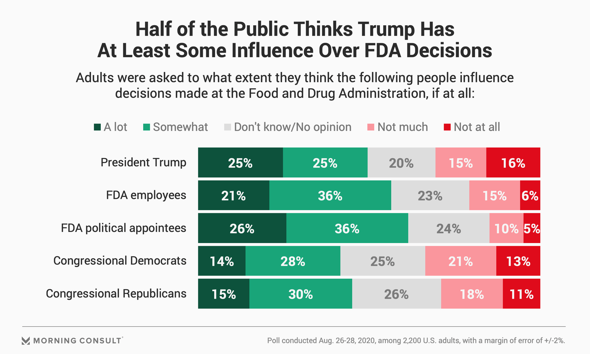 In the Morning Consult poll, 50 percent of the public said Trump influences the FDA’s decisions at least somewhat, compared with 62 percent who think the same of FDA political appointees and 57 percent who said agency employees in general affect decisions.