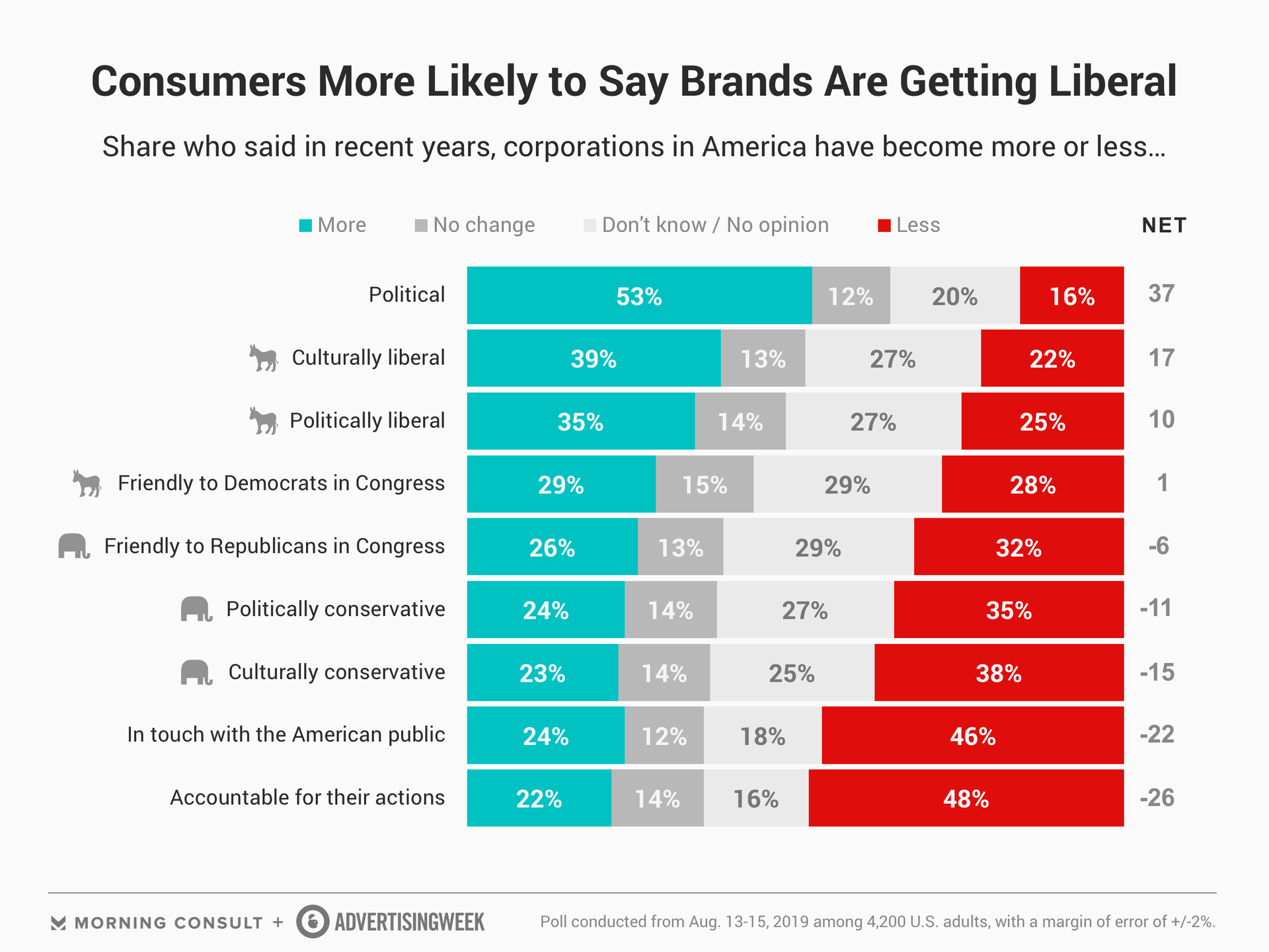 - Consumers are 16 points more likely to say brands have become more culturally liberal than conservative, and 11 points more likely to say the same of corporations’ politics.