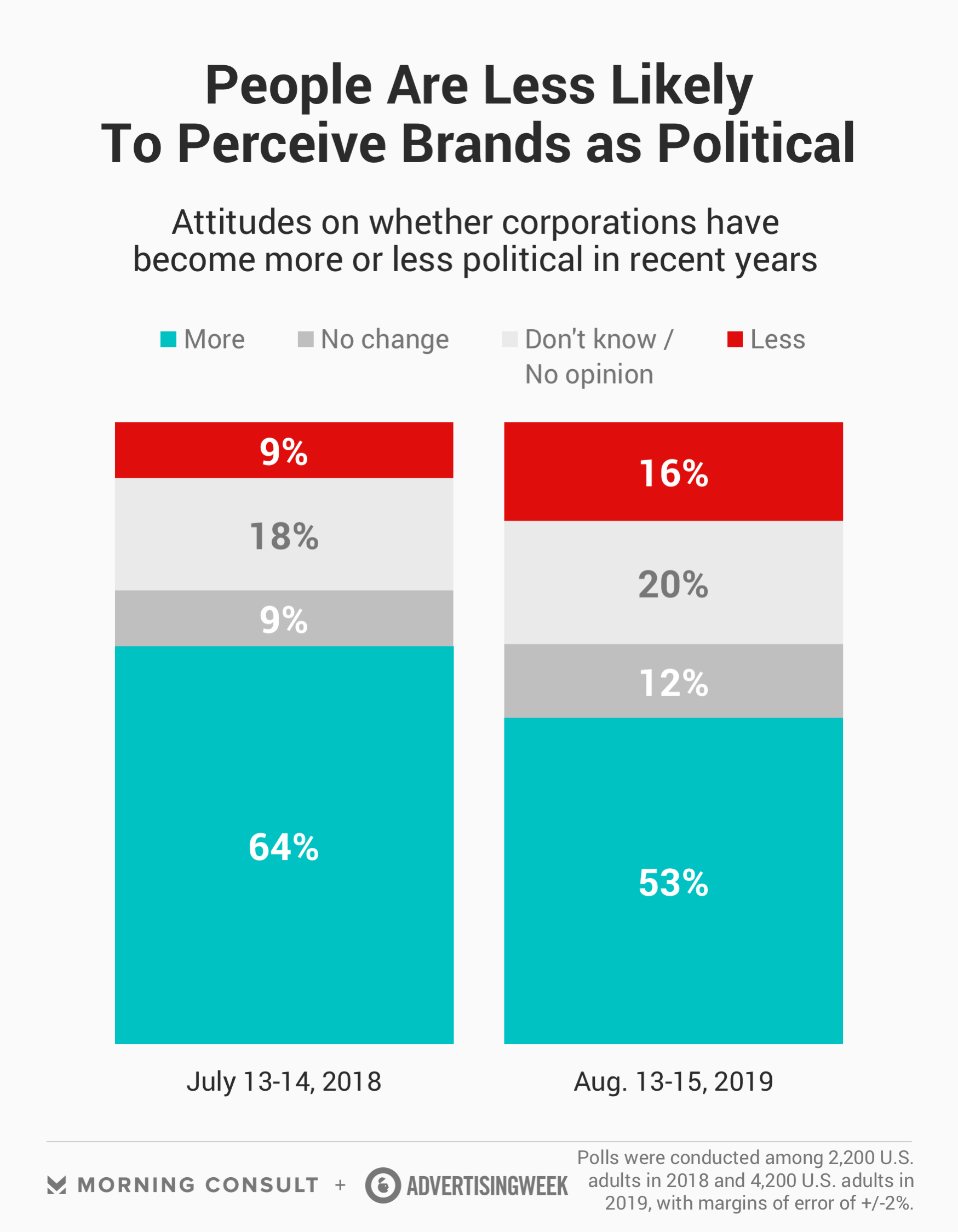 - 53% of the public says brands have gotten more political, down 11 points from July 2018.