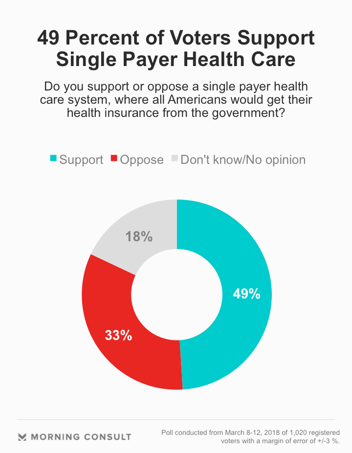 Among 1,020 registered voters in a March poll subsample, a 49 percent plurality said they would support the idea of single-payer health care, in which all Americans would get their health insurance from the government, while 33 percent said they oppose it and 18 percent didn't know or had no opinion. The margin of error in the subsample is 3 percentage points.