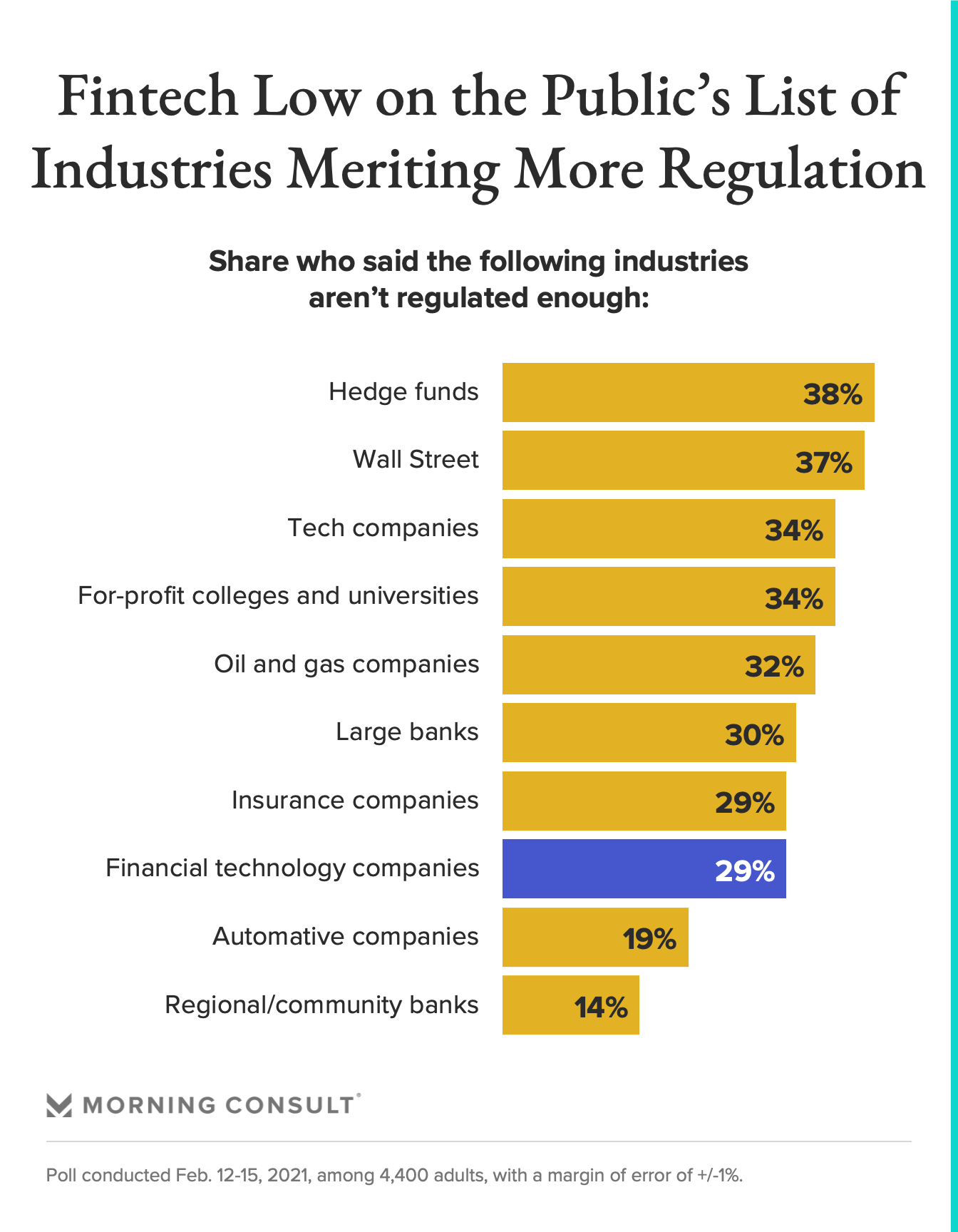 On a list of industries the public says merits more regulation, fintech came in well below hedge funds (38 percent), Wall Street (37 percent) and tech companies (34 percent). Nearly 2 in 5 respondents, however, said that the government should protect consumers from fintech companies by increasing regulation, compared to 16 percent who said the government should encourage fintechs to innovate by reducing regulation.