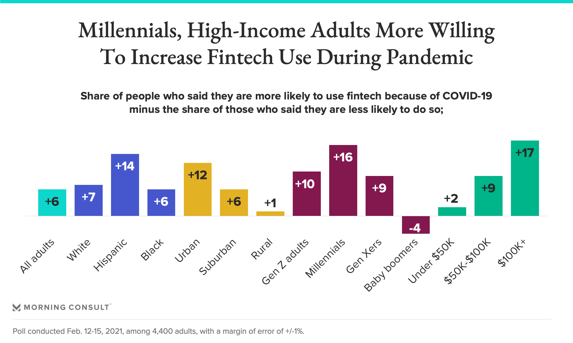 Those who live in urban areas favor using fintech because of the pandemic by 12 points, compared to 6 points in suburban areas and 1 point in rural areas. And young people, unsurprisingly, were also more enthusiastic about fintech.