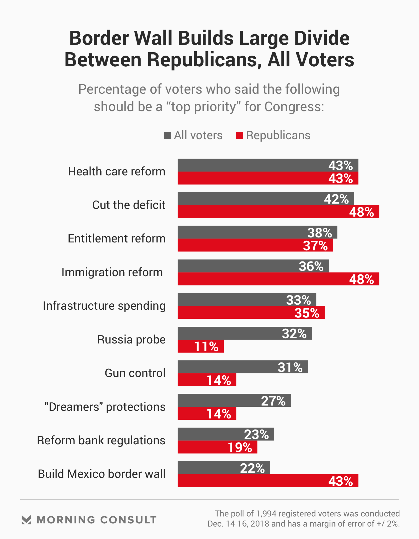 President Donald Trump has spent much of the past month saying it’s imperative that Congress helps him build his proposed border wall with Mexico. But as lawmakers searched for a deal with the White House to avert a partial government shutdown, a new Morning Consult/Politico poll shows voters place wall funding at the bottom of a list of 10 actions they say should be a top priority for Congress.