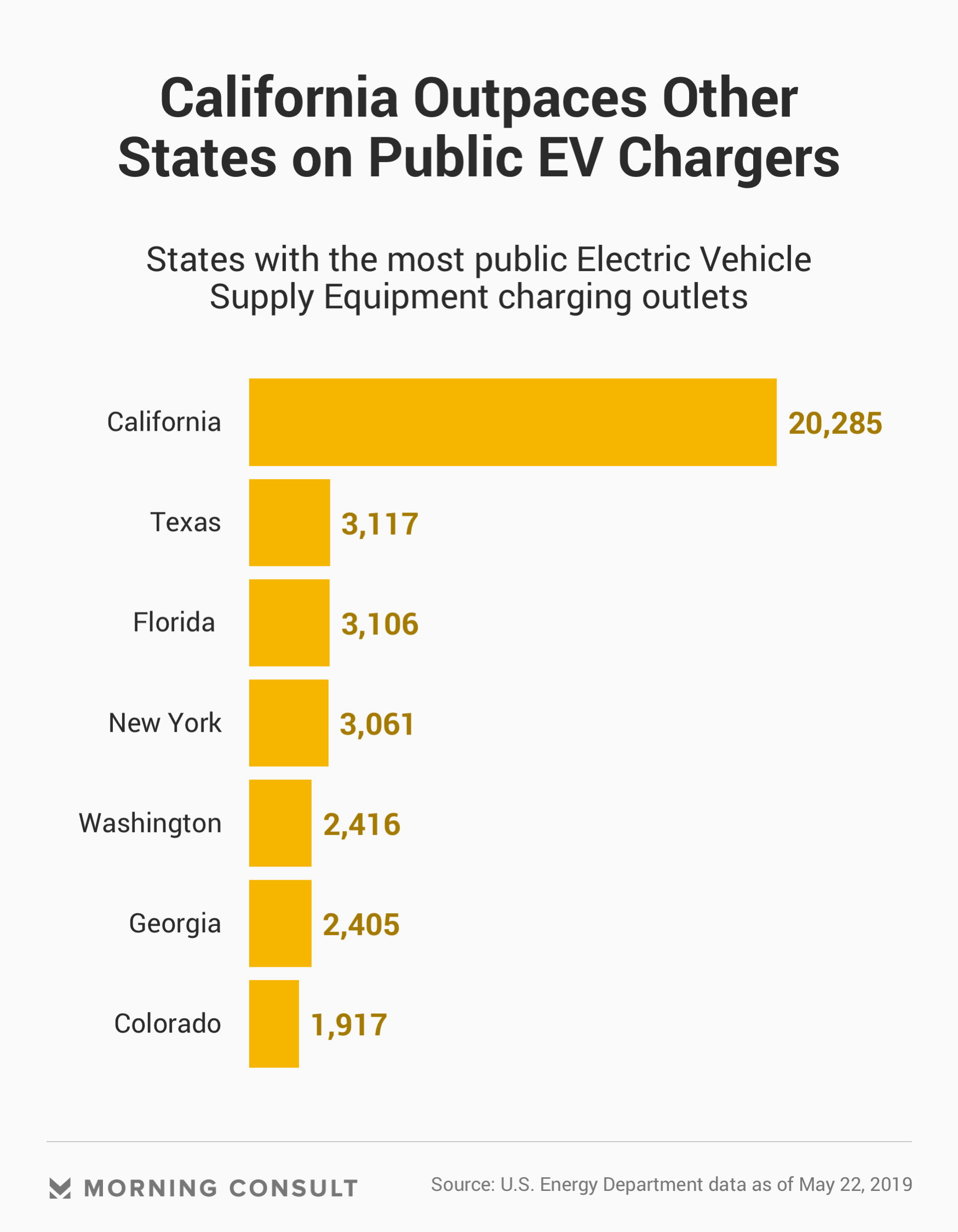 Public charging has been installed at varying rates nationwide. California is in the lead with more than 20,000 public charging outlets as of May 21, according to the Energy Department while Texas, in second place, has substantially fewer at around 3,100.